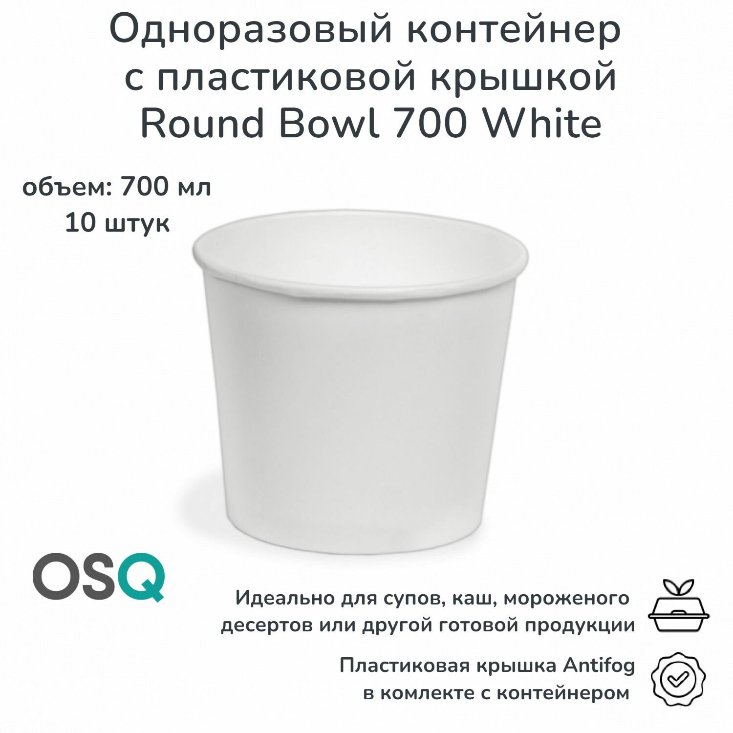 Купить Одноразовые контейнеры для супа с плоской пластиковой крышкой OSQ, круглые супники, белые, объем 700 мл, 10 шт.