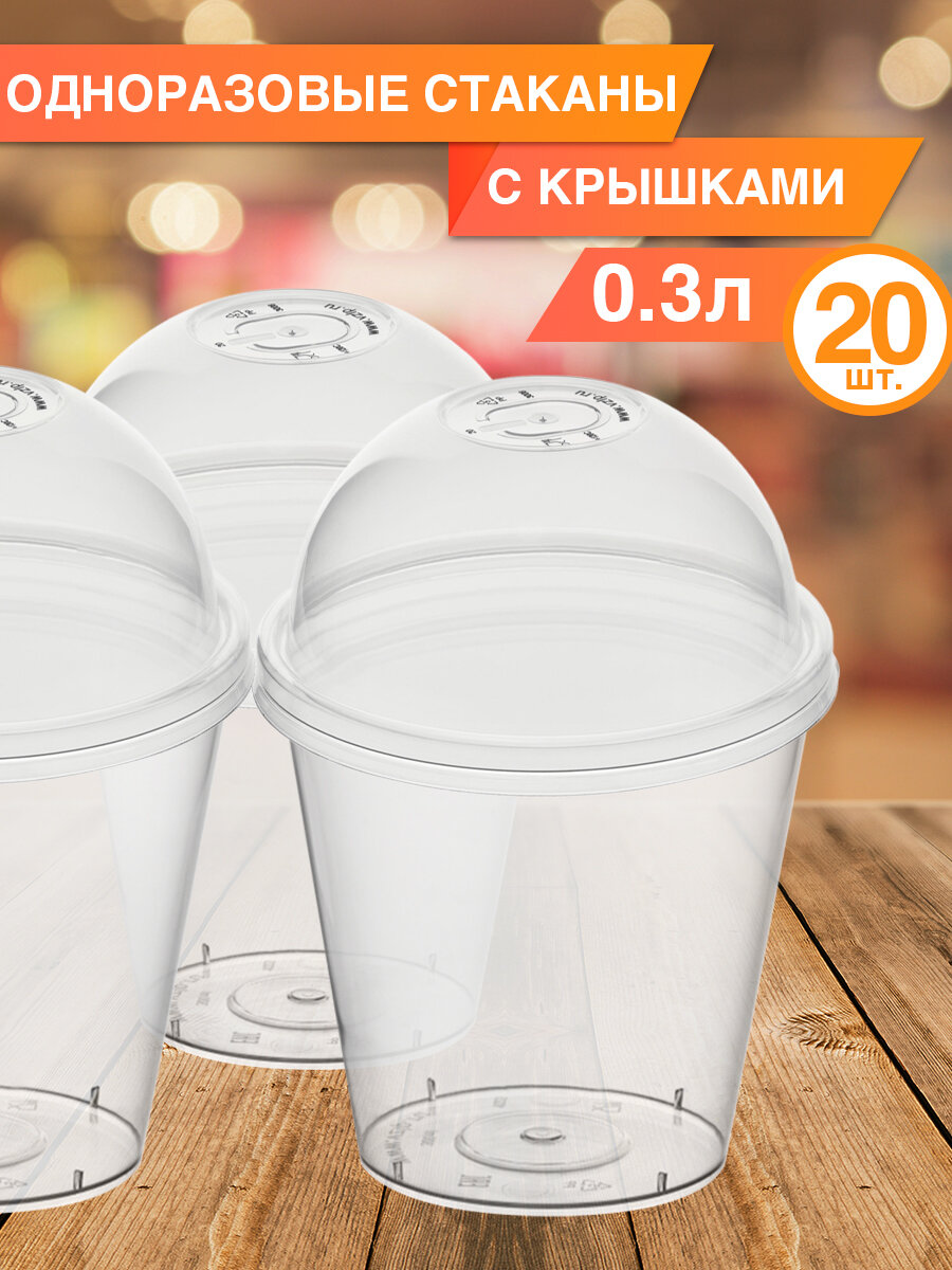 Купить Одноразовые стаканы пластиковые 300 мл с купольной крышкой, 20 шт