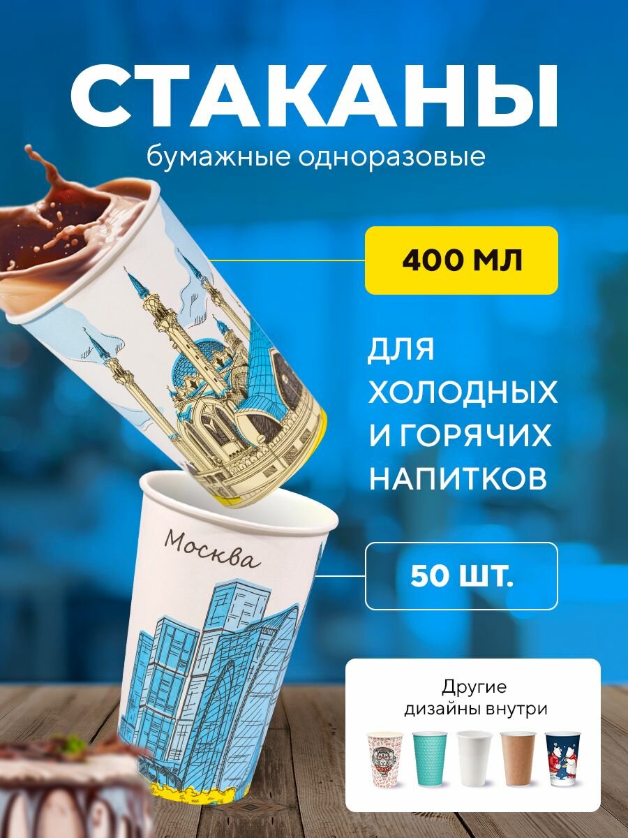 Купить Бумажные одноразовые стаканы, 400мл, города, однослойные, для кофе, чая, холодных и горячих напитков, 50 шт в упаковке.