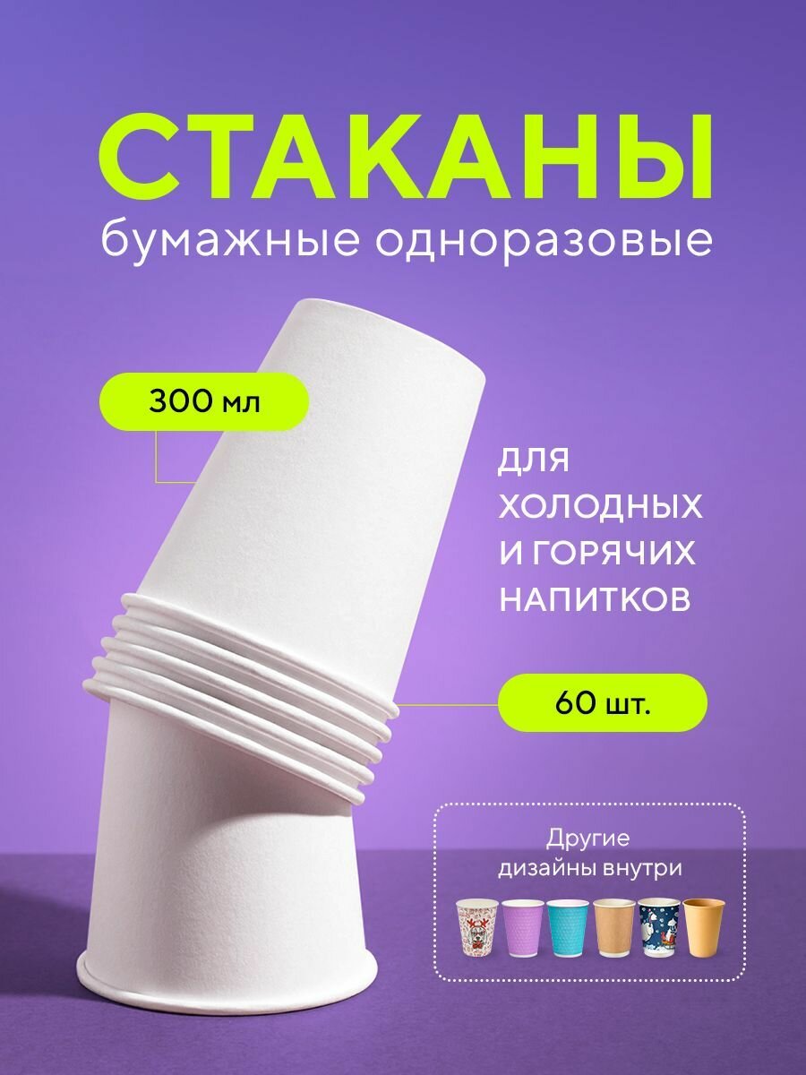Купить Бумажные одноразовые стаканы, 300 мл, белые, однослойные, для кофе, чая, холодных и горячих напитков, 60 шт в упаковке