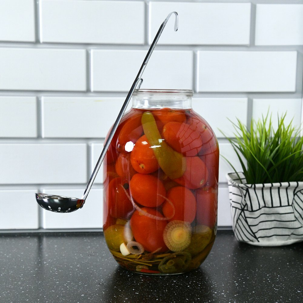Половник для банок и консервов изготовлено из стали с хромированным покрытием, длина 29 см. интересное: