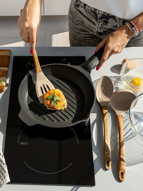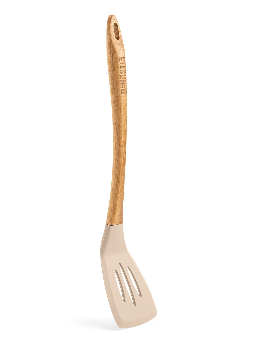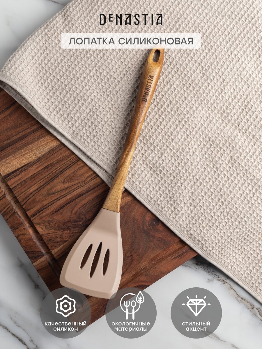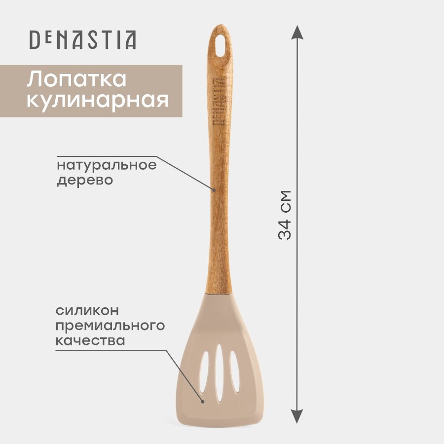 Лопатка кулинарная с прорезями DeNASTIA с деревянной ручкой 34x7,5x1,6см, силикон + акация, бежевая интересное: