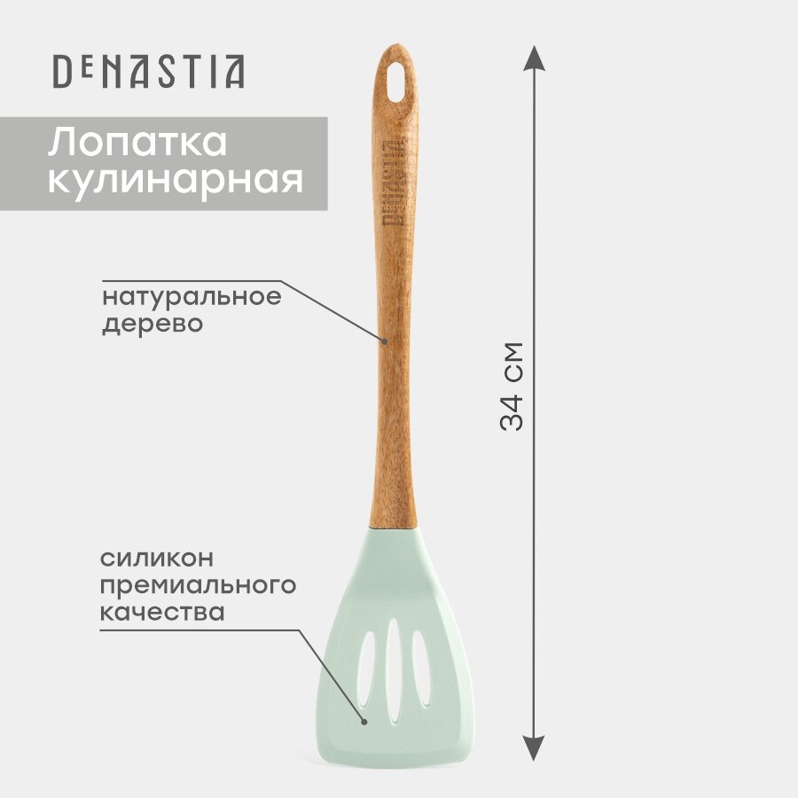 Лопатка кулинарная с прорезями DeNASTIA с деревянной ручкой 34x7,5x1,6см, силикон + акация, мятная интересное: