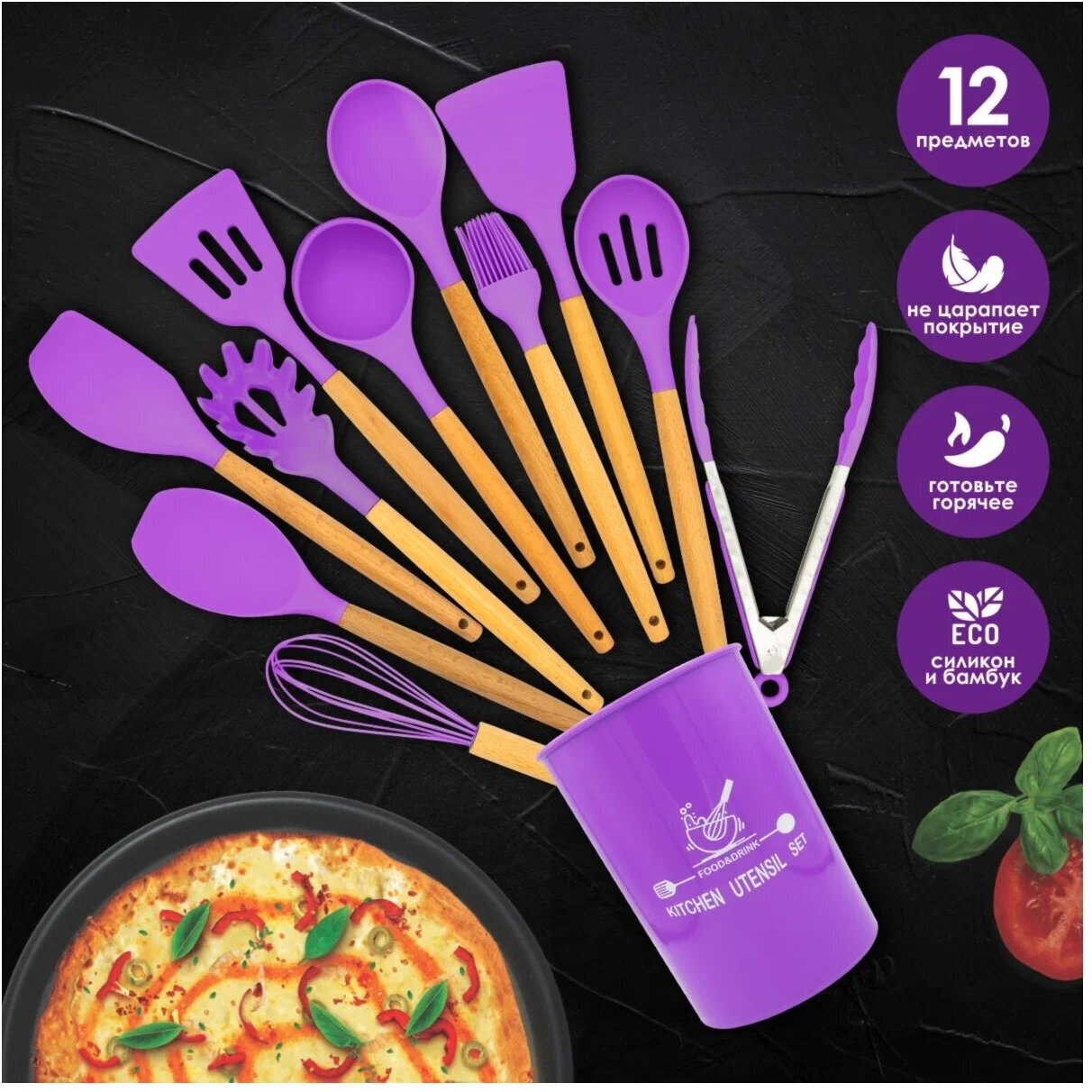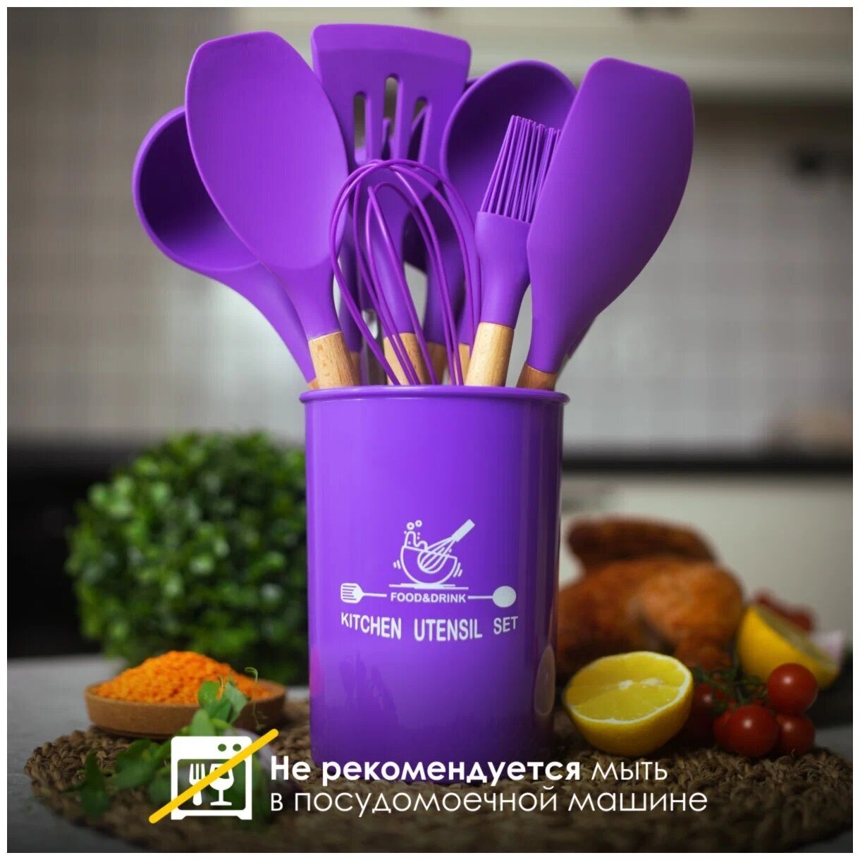 Набор кухонных принадлежностей из силикона с деревянной ручкой, 11 шт, фиолетовый, Kitchen Angel KA-SLOP-08 интересное: