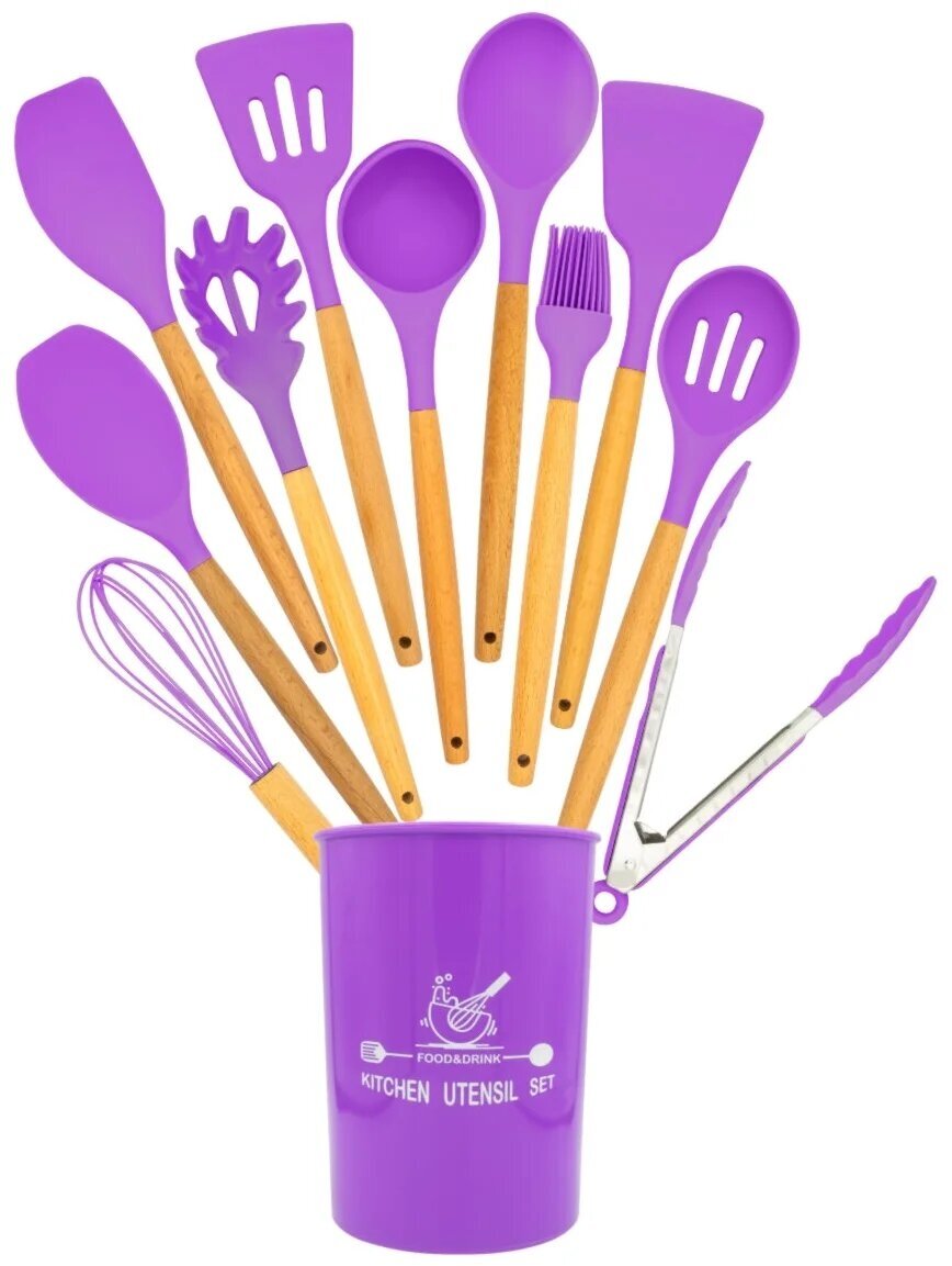 Купить Набор кухонных принадлежностей из силикона с деревянной ручкой, 11 шт, фиолетовый, Kitchen Angel KA-SLOP-08