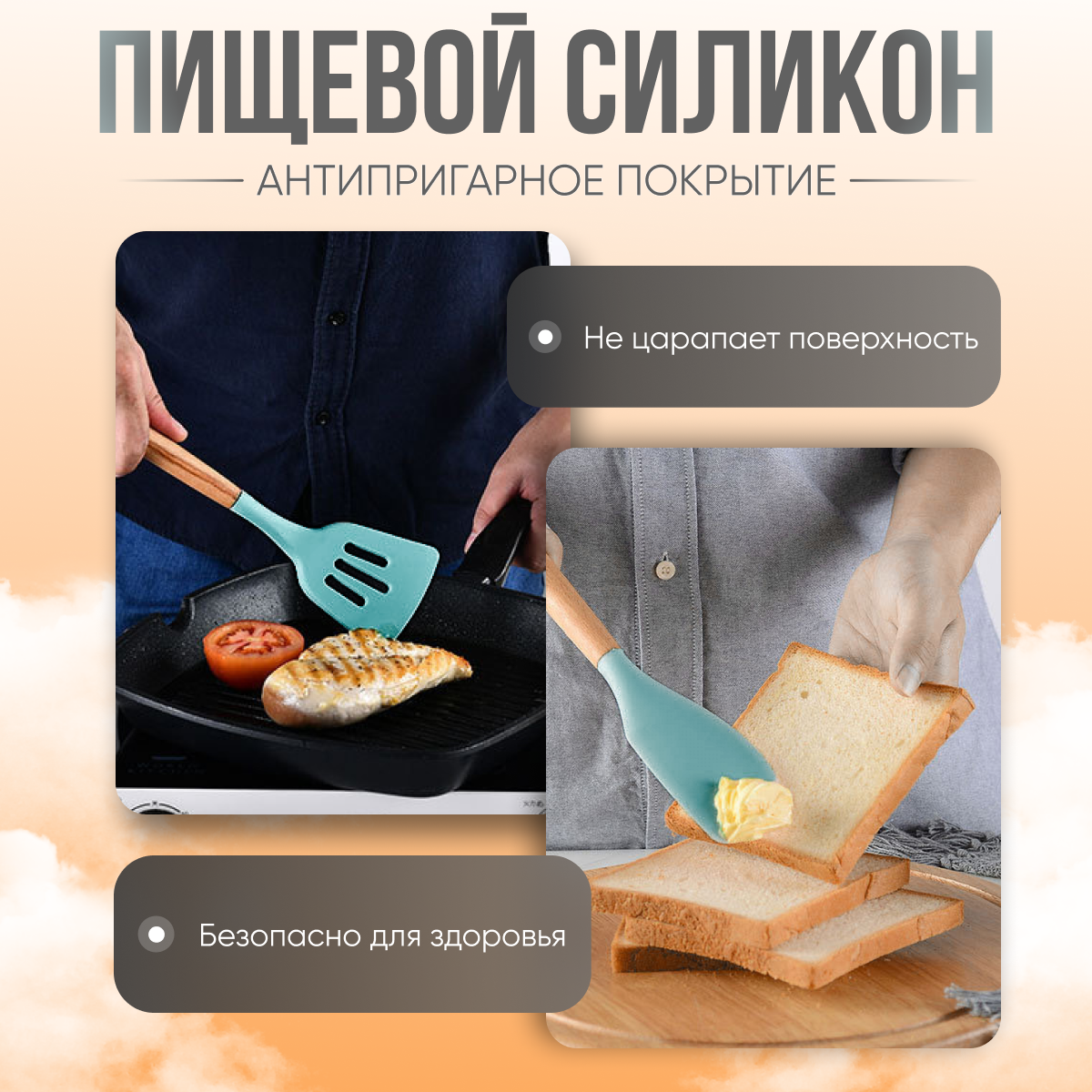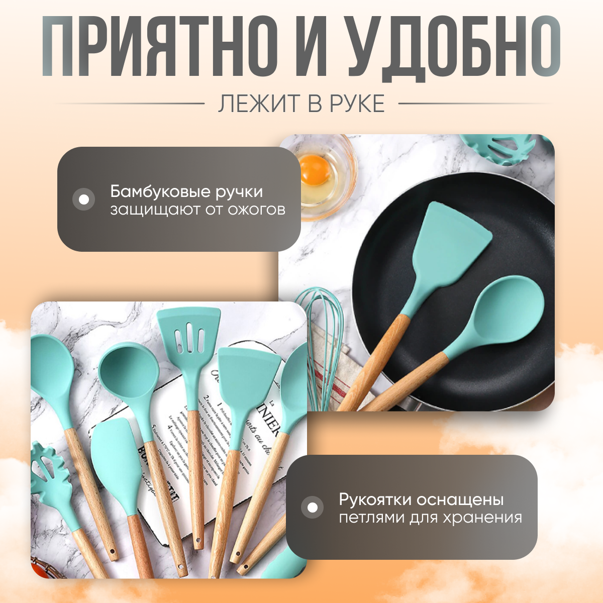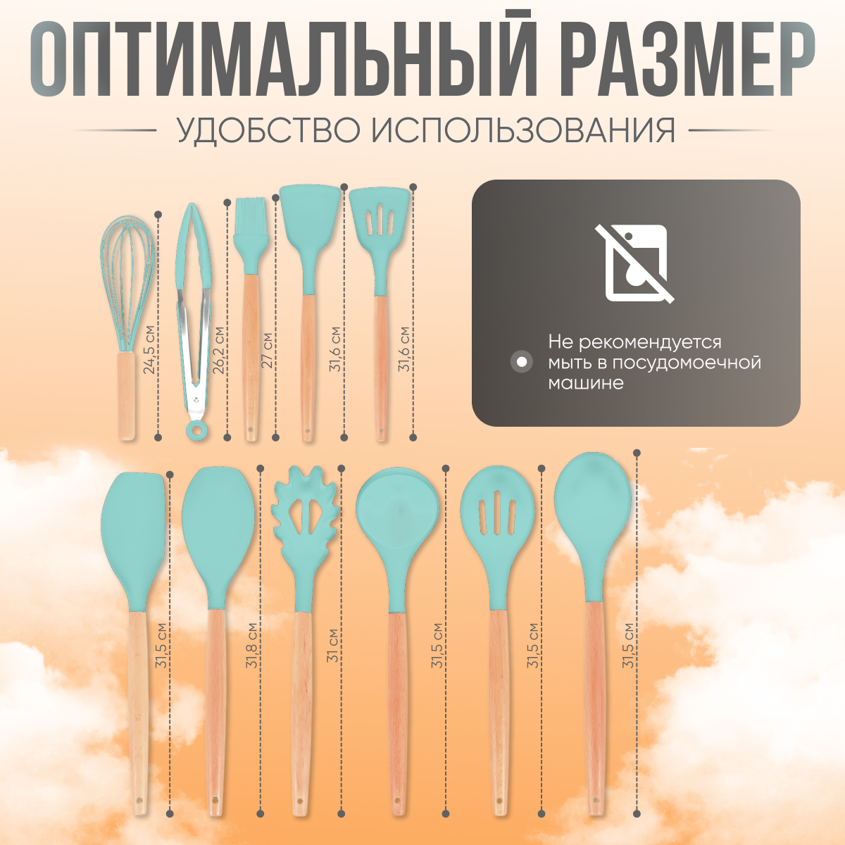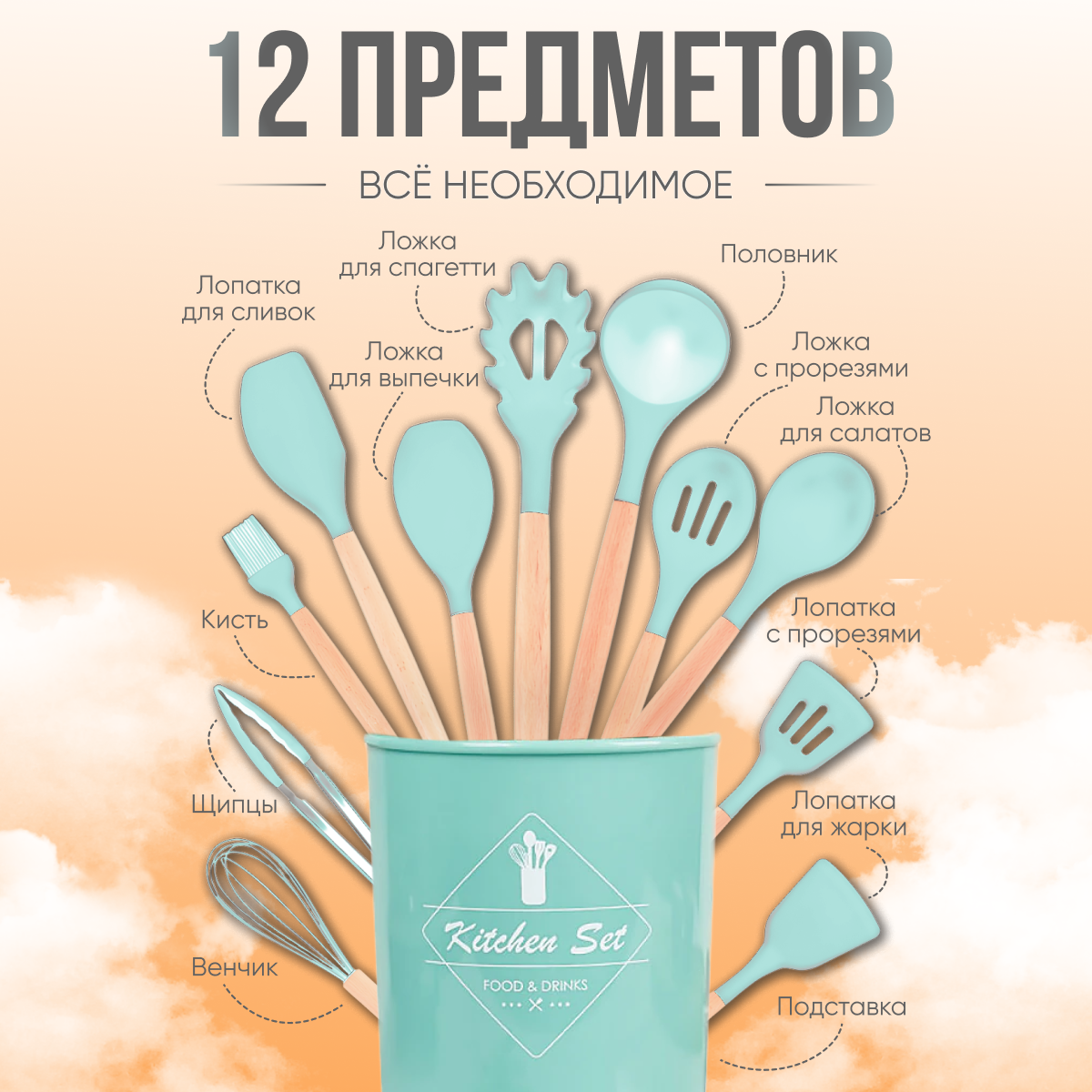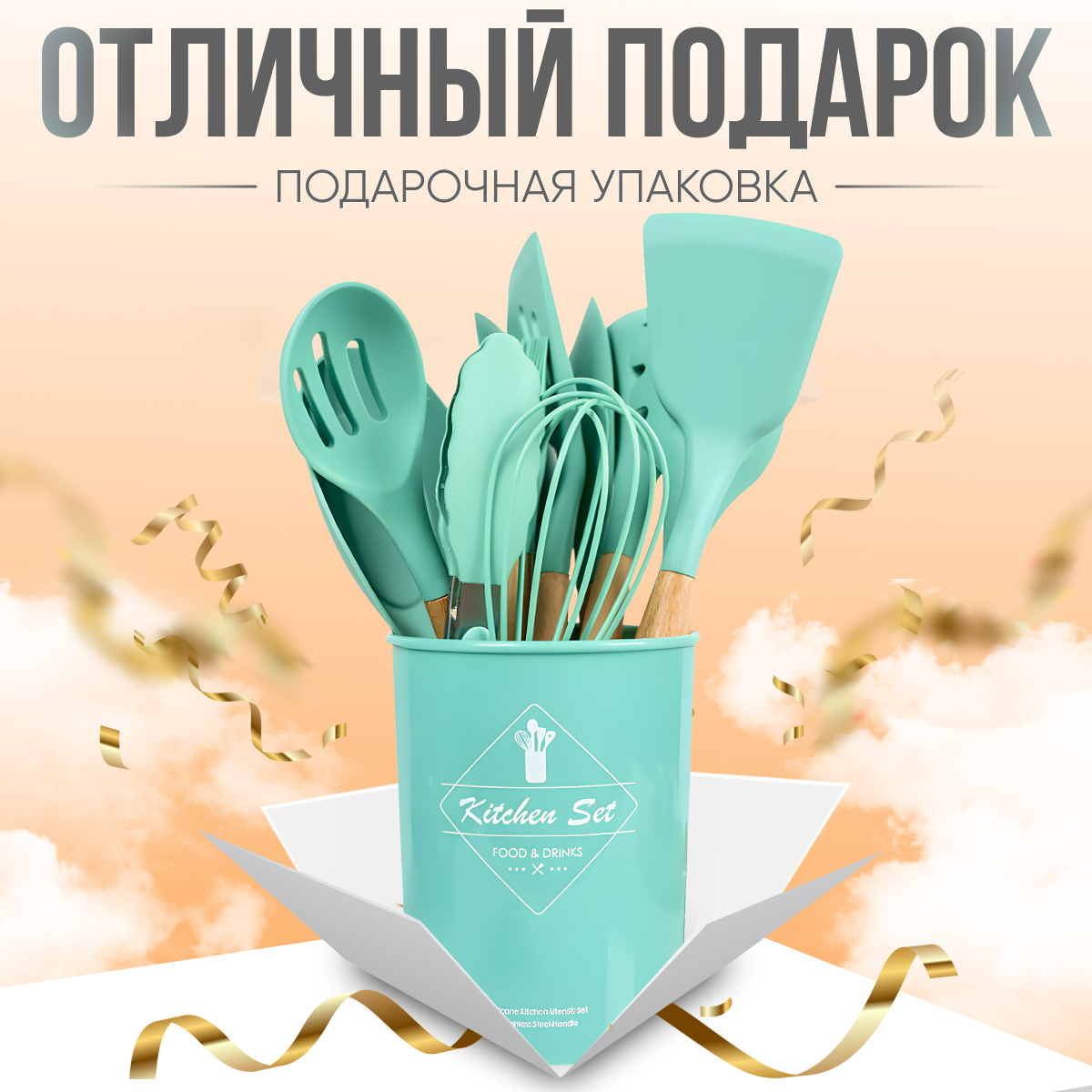 Набор кухонных принадлежностей FGS, 12 предметов+подставка, бирюзовый интересное: