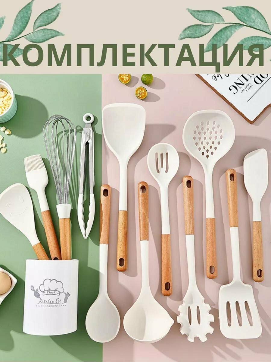 Набор кухонных принадлежностей из силикона и бамбука 12 предметов интересное: