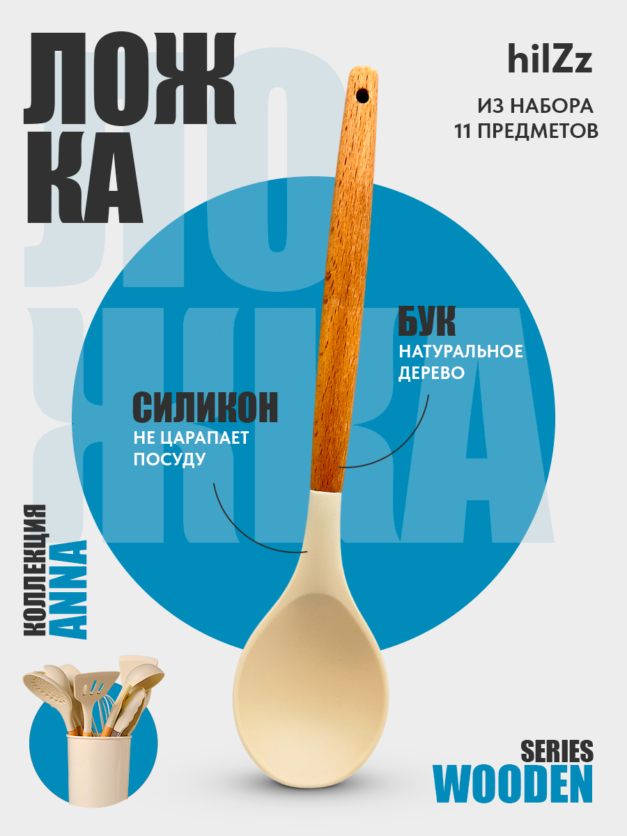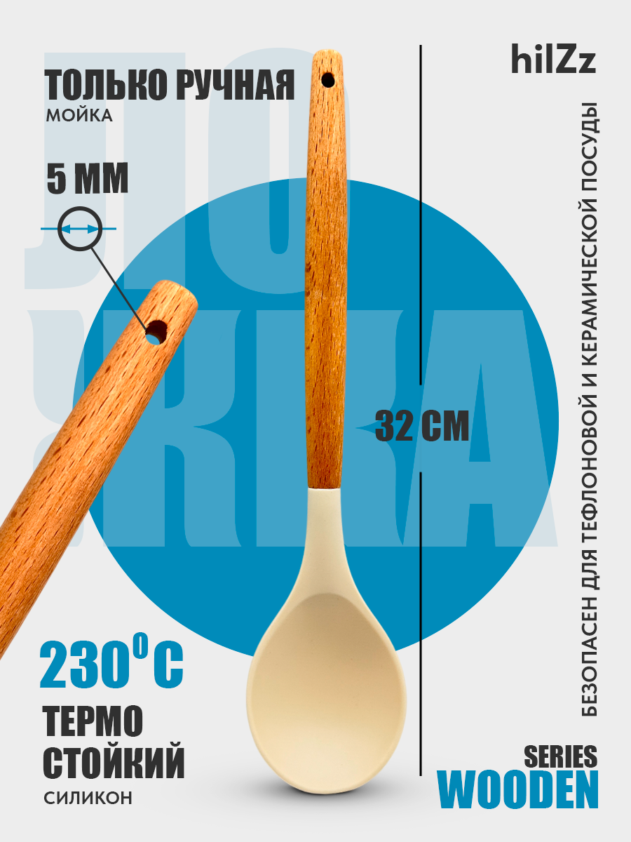Ложка кулинарная силиконовая с деревянной ручкой hilZz 32 см, молочная интересное: