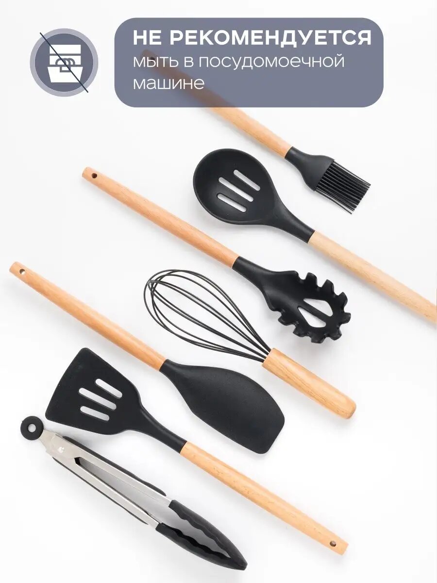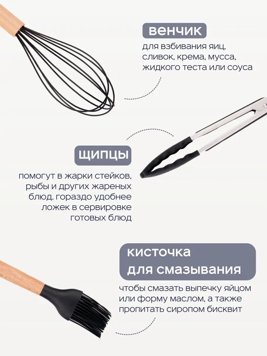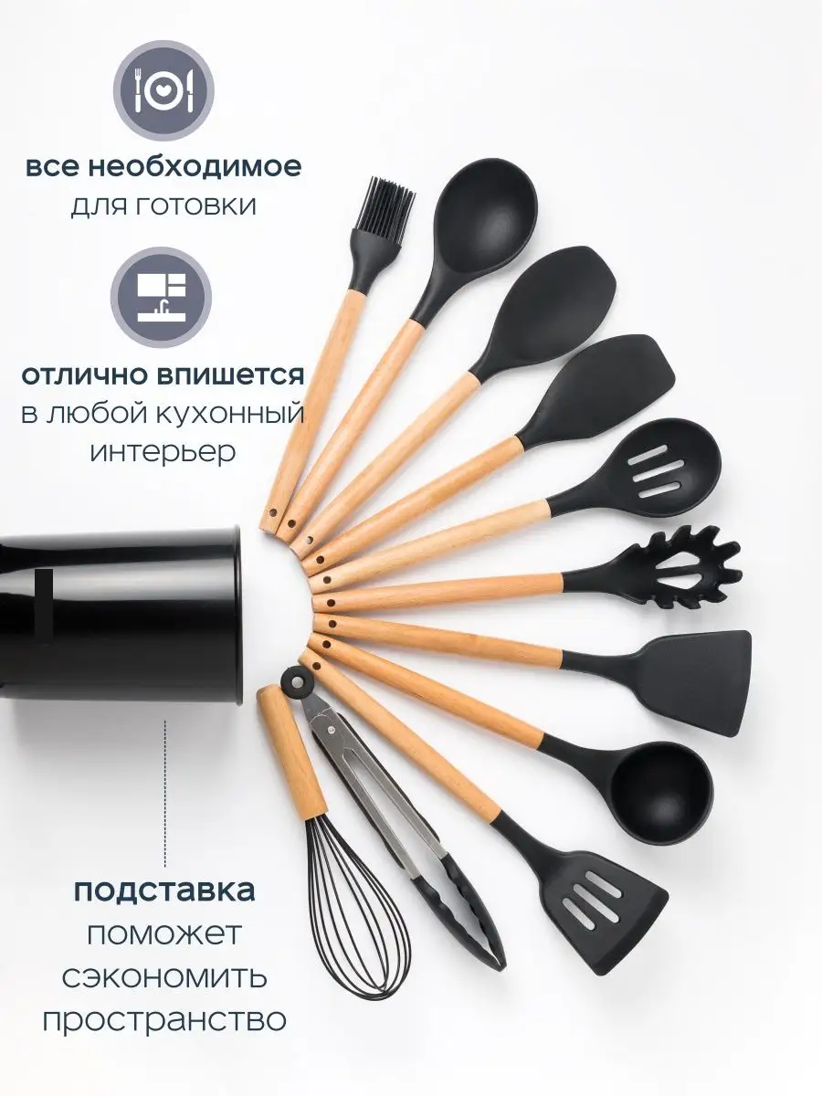 Набор кухонных принадлежностей 11 в 1, силиконовый с деревянной ручкой интересное: