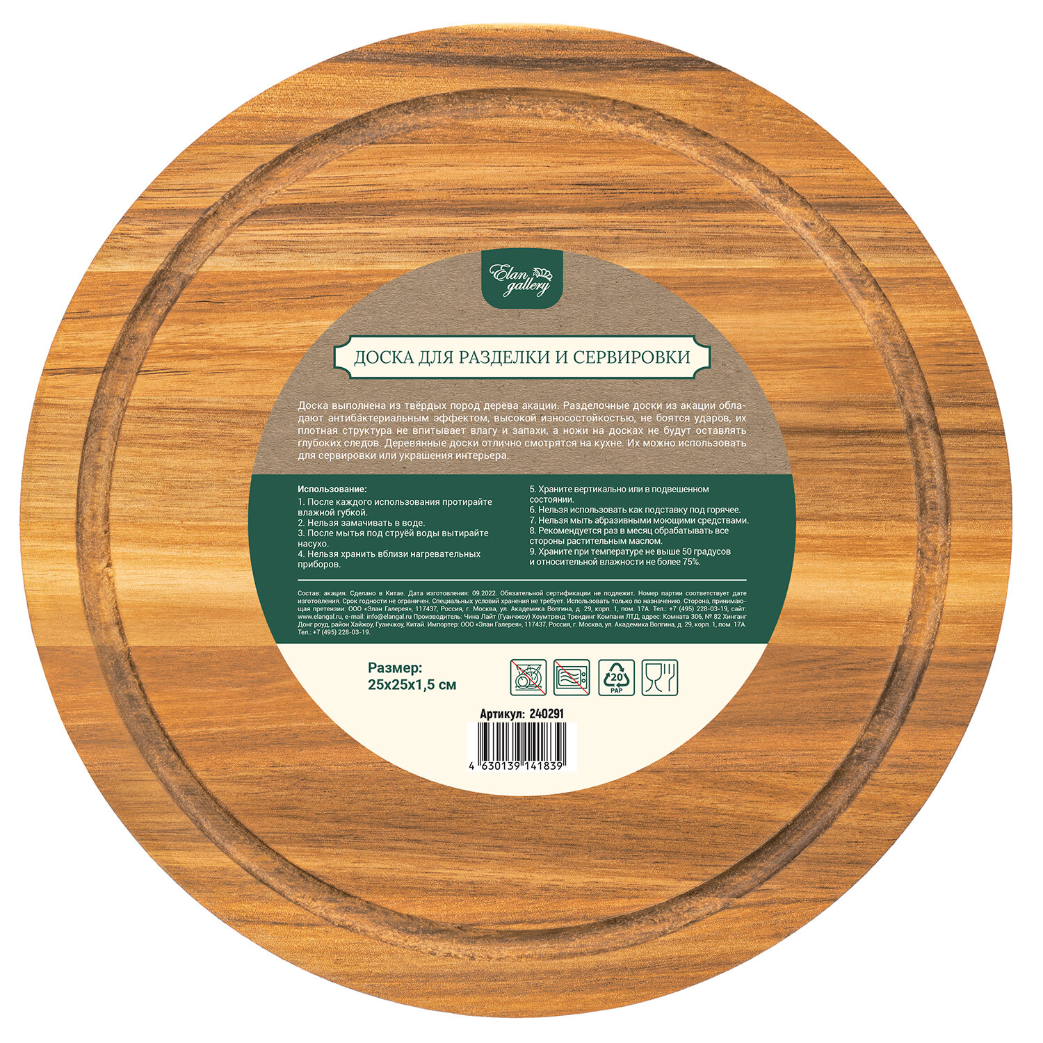 Доска для разделки-сервировки 25х25х1,5 см Elan Gallery, круглая, дерево акации интересное: