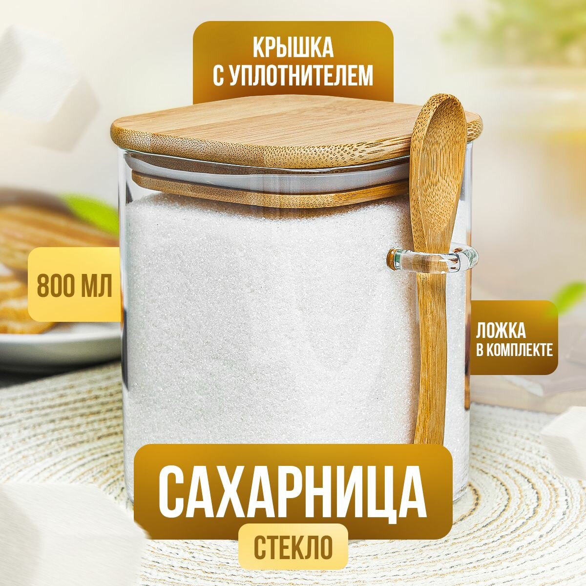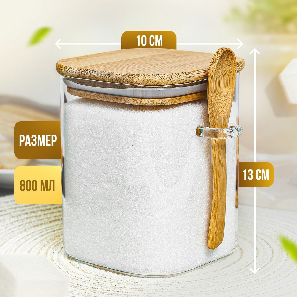 Сахарница стеклянная Kalinka с бамбуковой крышкой и ложкой, 800 мл интересное: