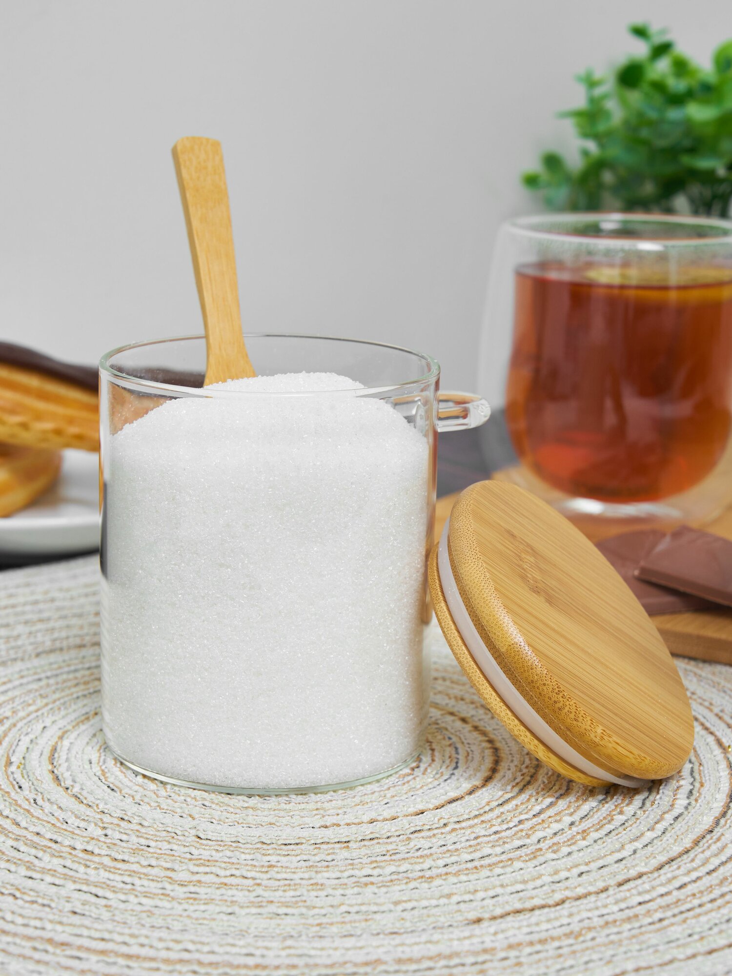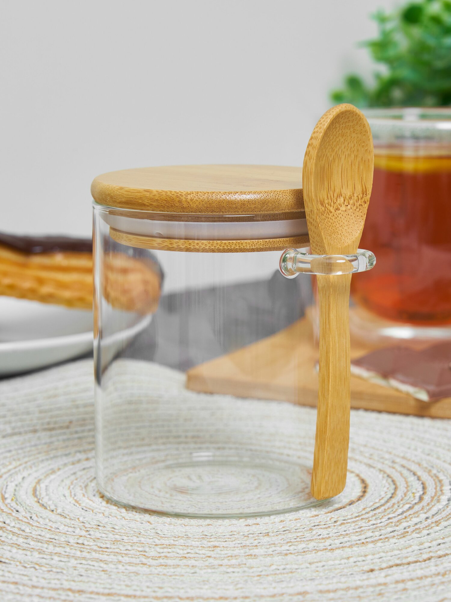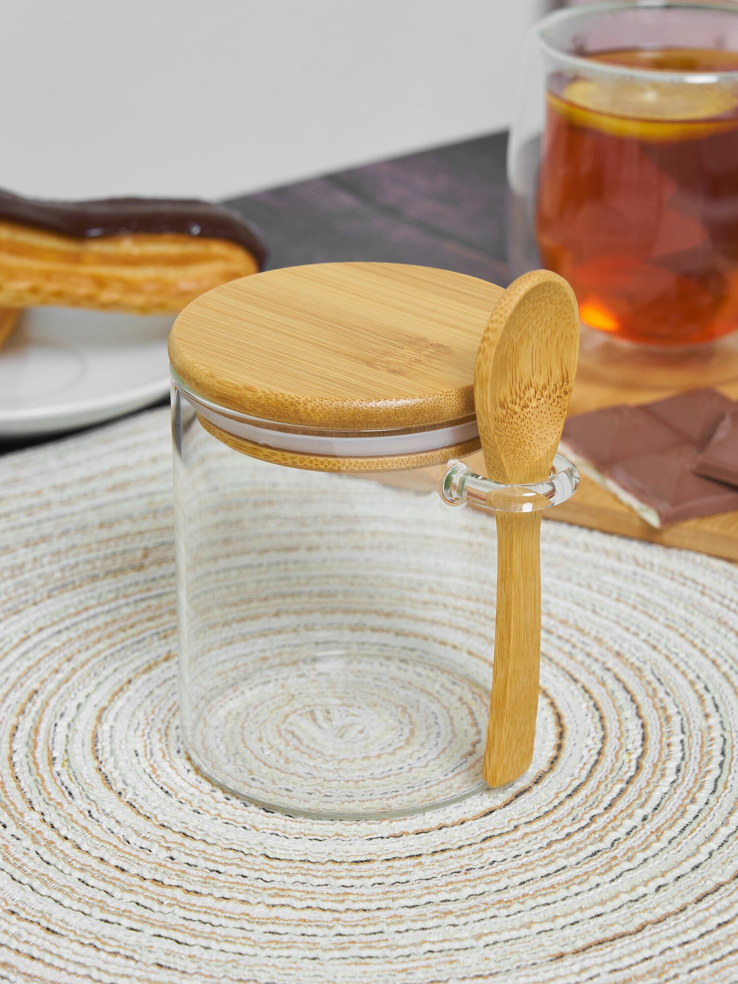 Купить Сахарница стеклянная Kalinka с бамбуковой крышкой и ложкой, 470 мл