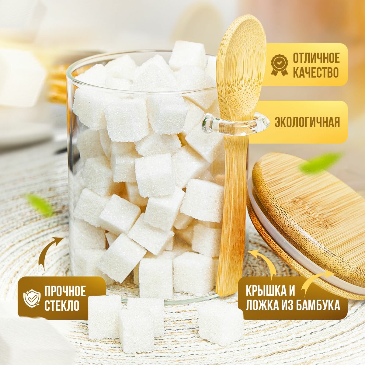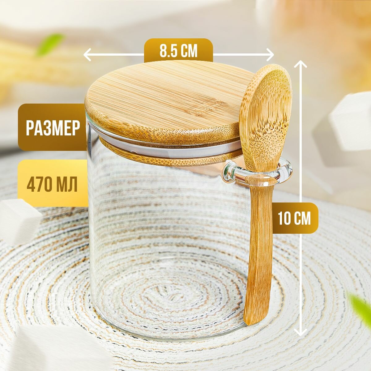 Сахарница стеклянная Kalinka с бамбуковой крышкой и ложкой, 470 мл интересное:
