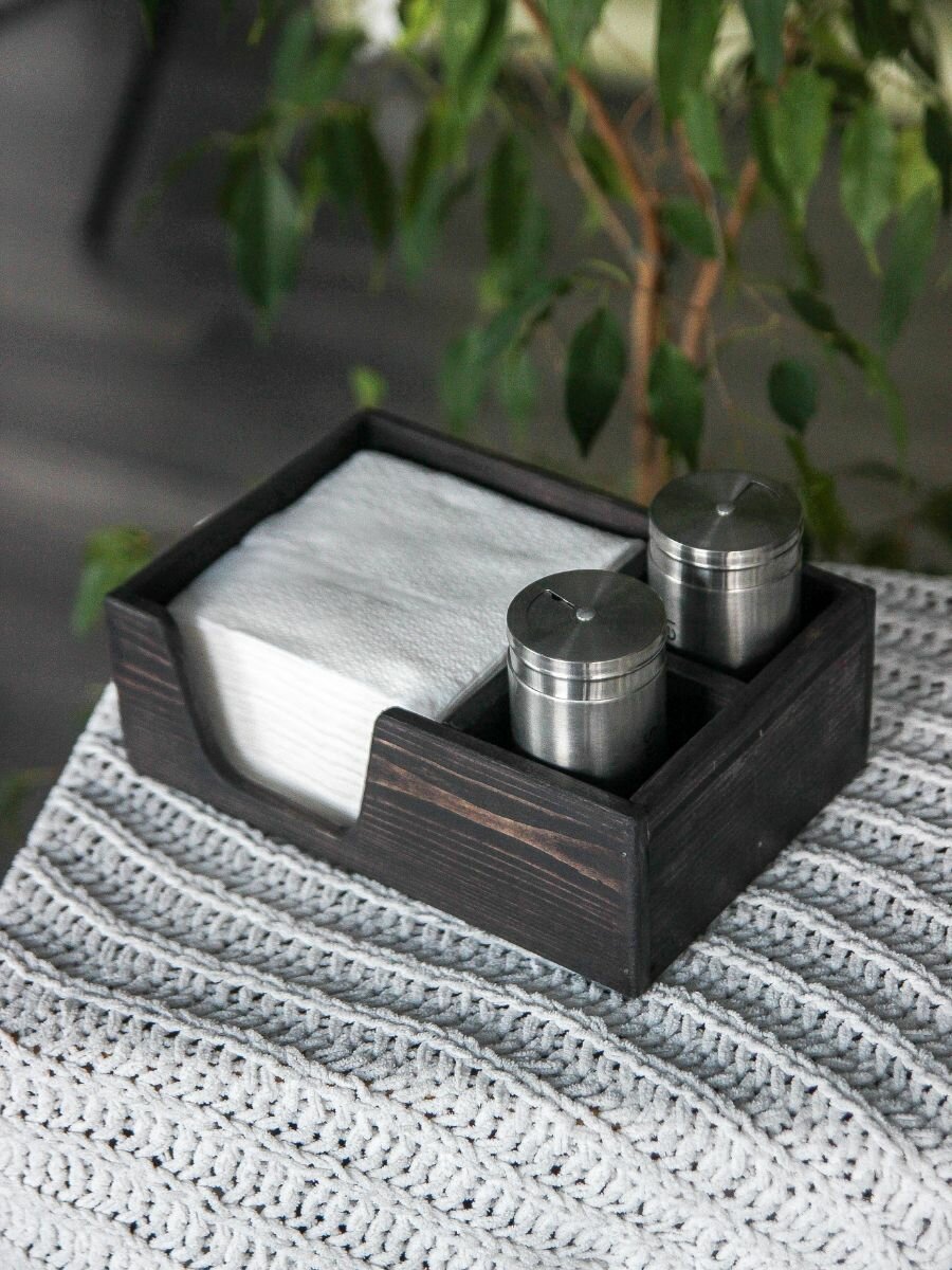 Черная салфетница деревянная кухонная с подставкой для специй интересное: