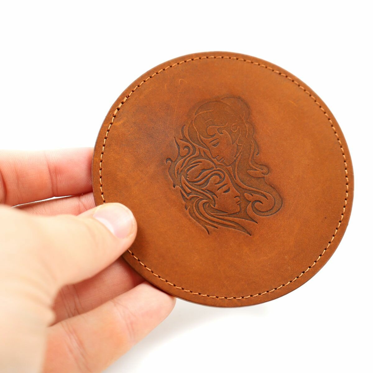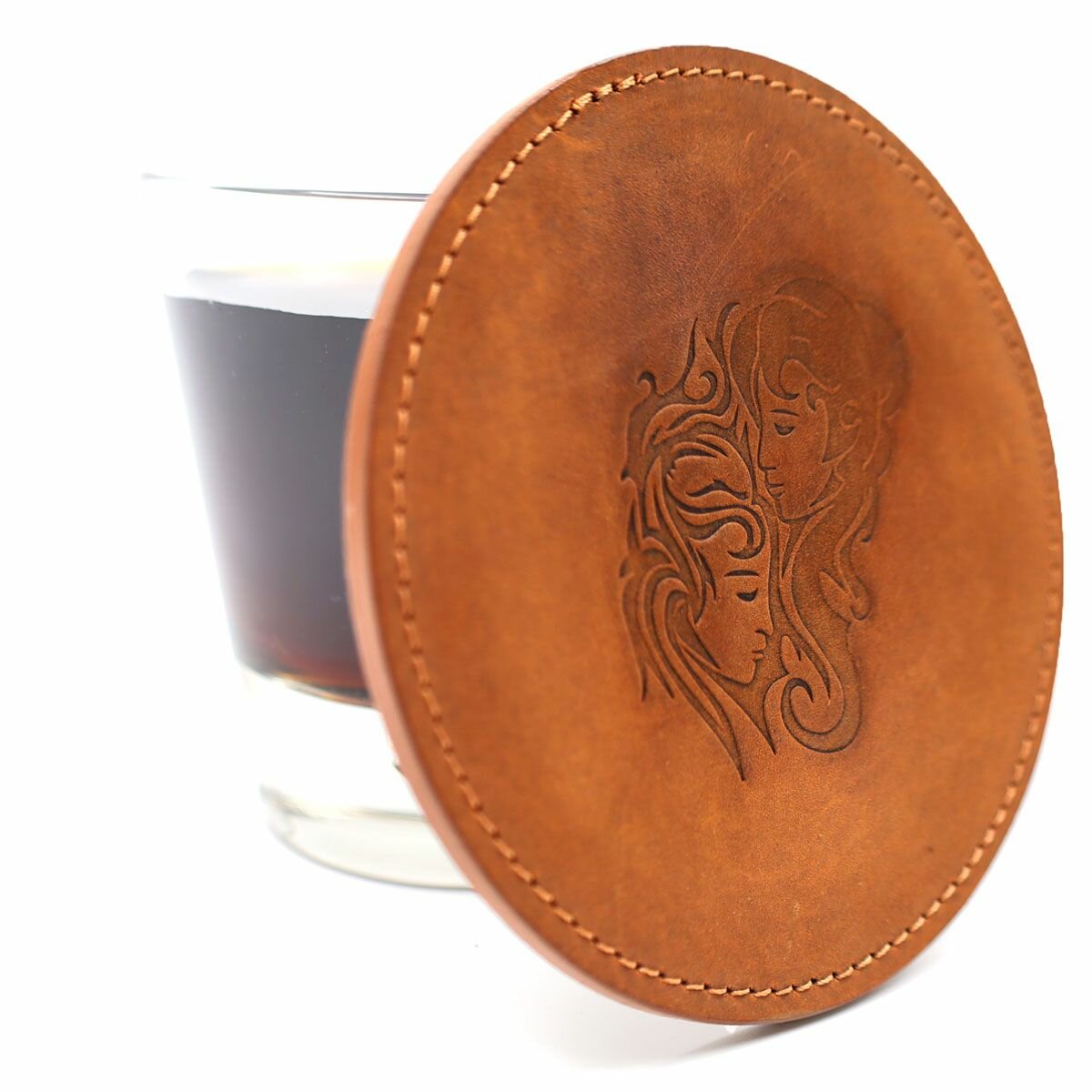 Кожаный подстаканник - бирдекель, подставка под кружку c тиснением "Близнецы", Frongoch Gemini Brownee, J.Audmorr