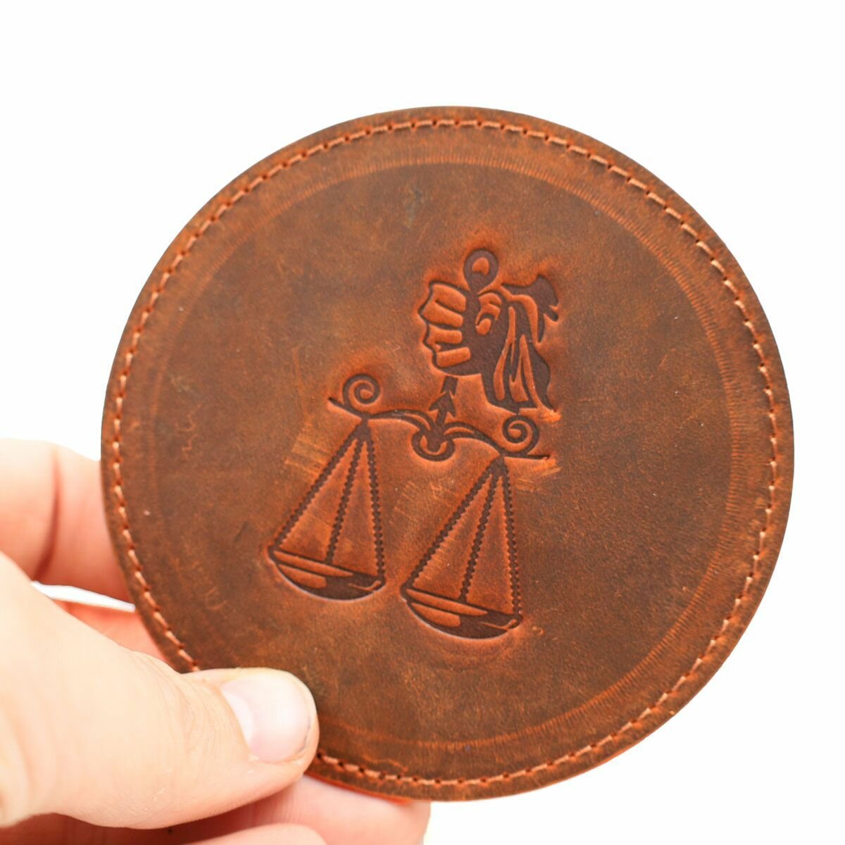 Кожаный подстаканник - бирдекель, подставка под кружку c тиснением "весы", Frongoch Libra Brownee, J.Audmorr