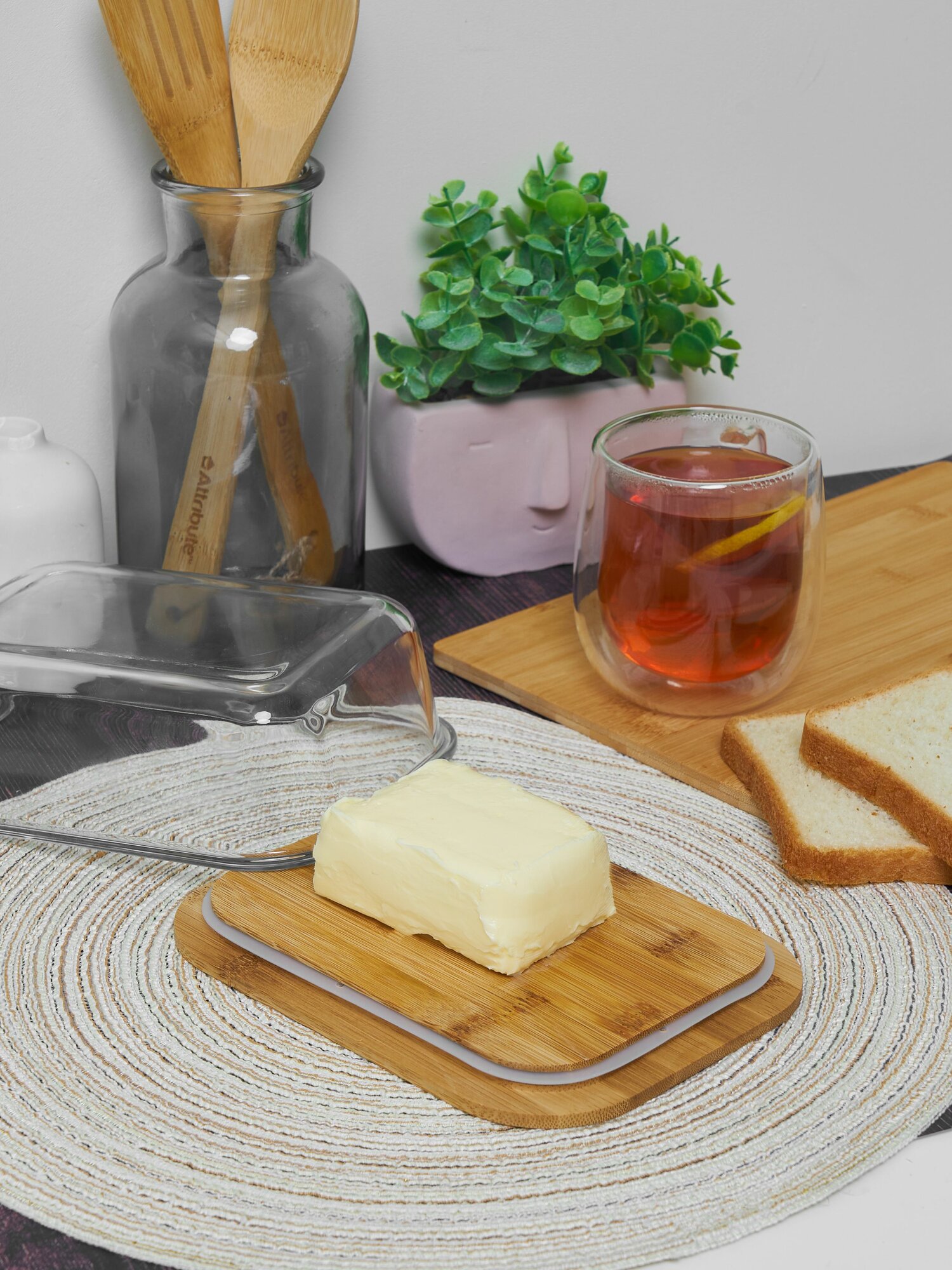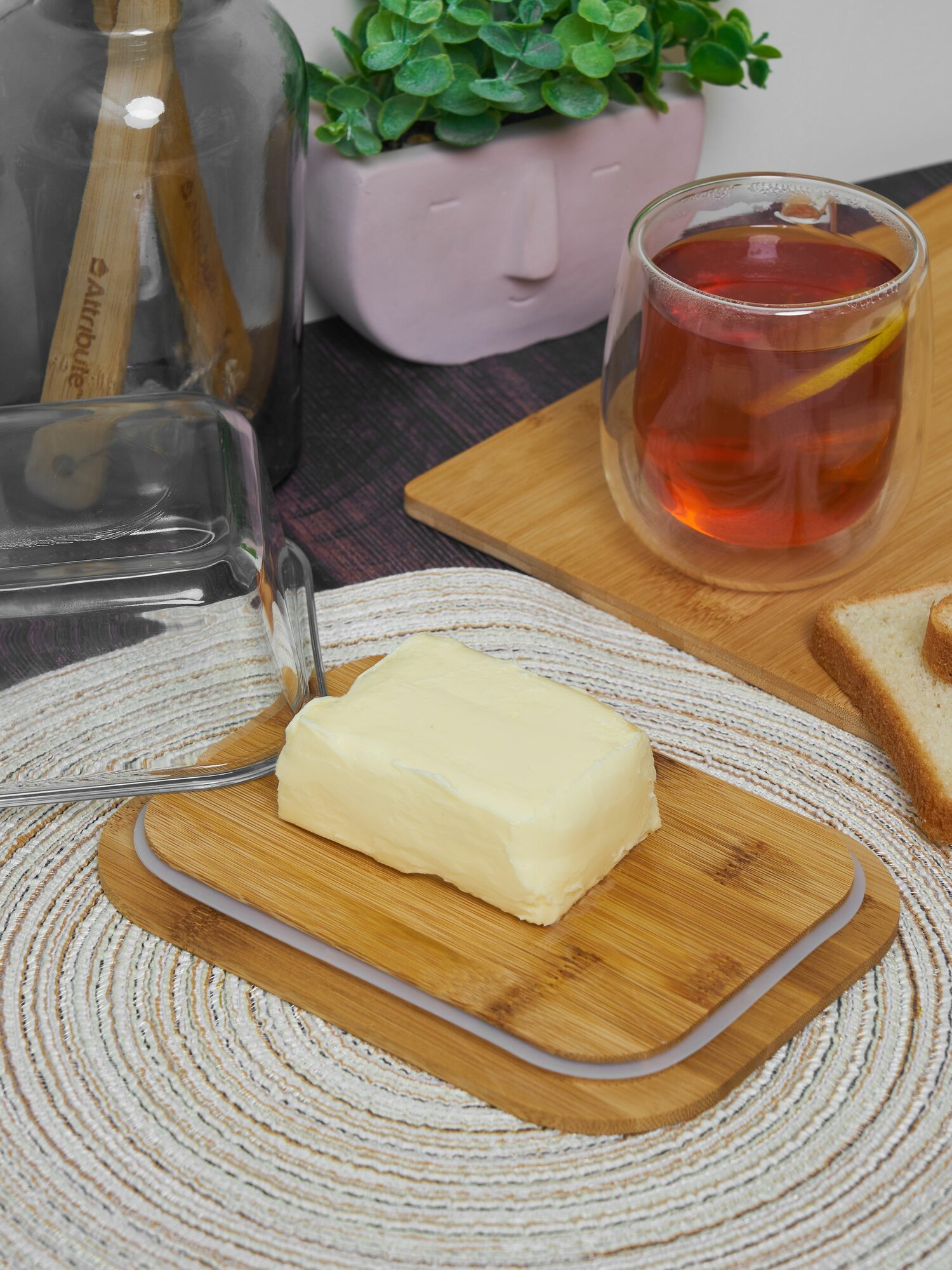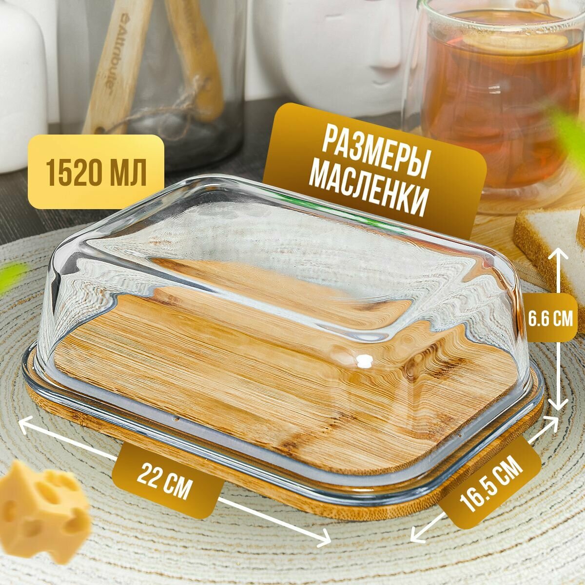 Масленка / сырница бамбуковая Kalinka со стеклянной крышкой, большая, 1520 мл, 18,6*14,1*6,6 см. интересное: