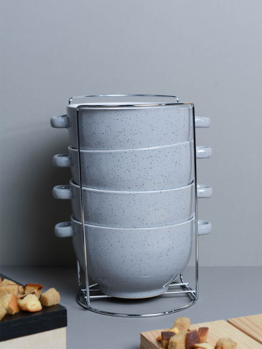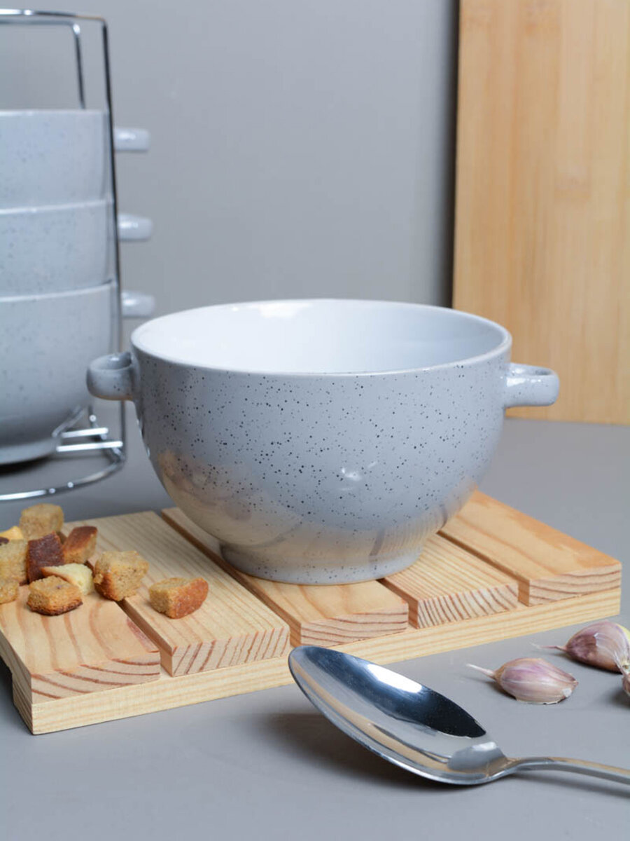 Супница с ручками 4 штуки на подставке Серый в крапинку интересное: