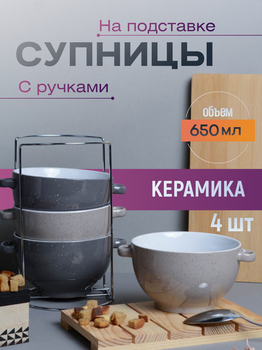 Супница с ручками 4 штуки на подставке Серый в крапинку