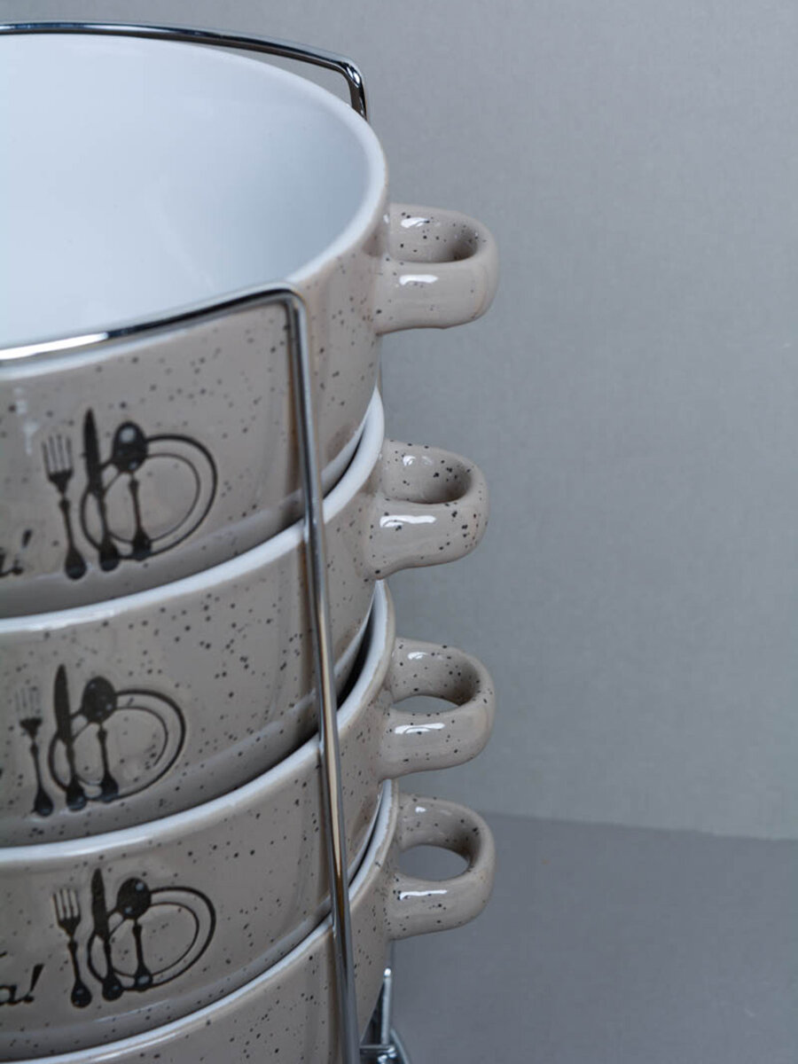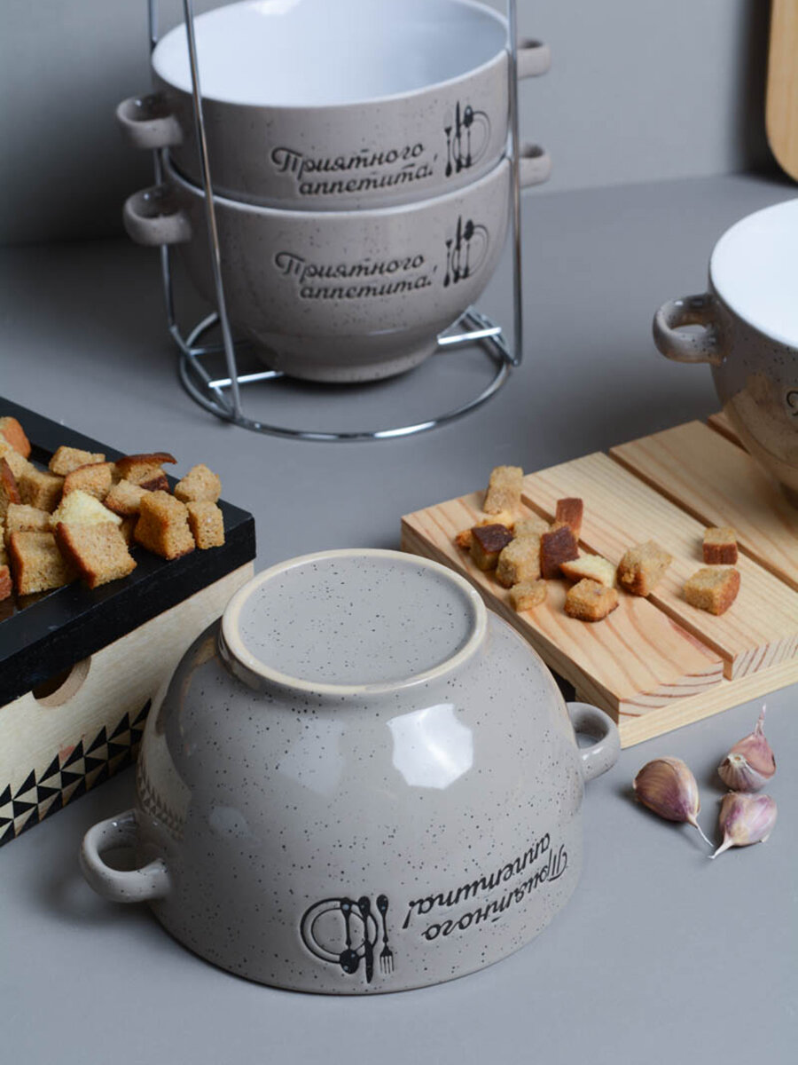 Супница с ручками 4 штуки на подставке Серый в крапинку