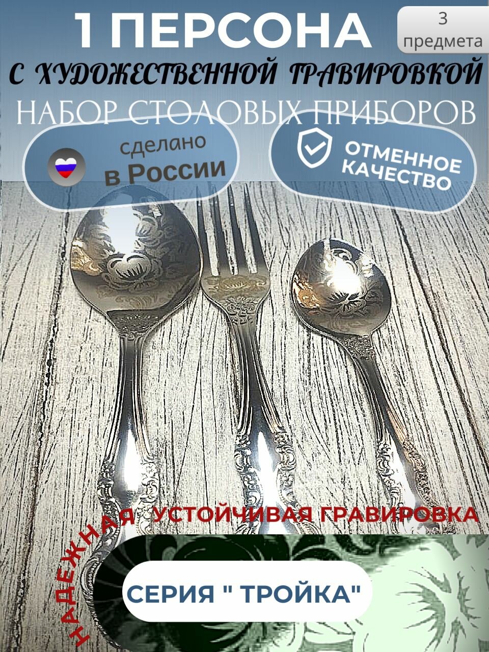 Купить Набор столовых приборов, ложка, вилка, чайная ложка, на 1 персону с гравировкой. Павловский завод. Серия тройка