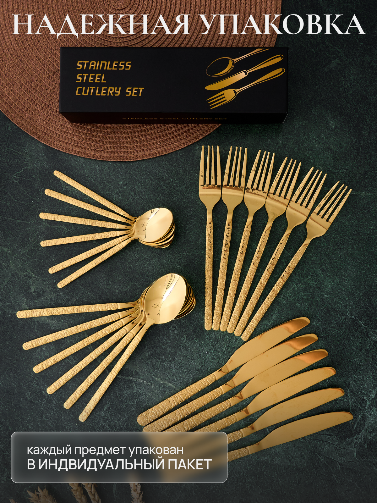 Набор столовых предметов из нержавеющей стали для 6 персон 24 предмета с узором "Камень", золотой интересное:
