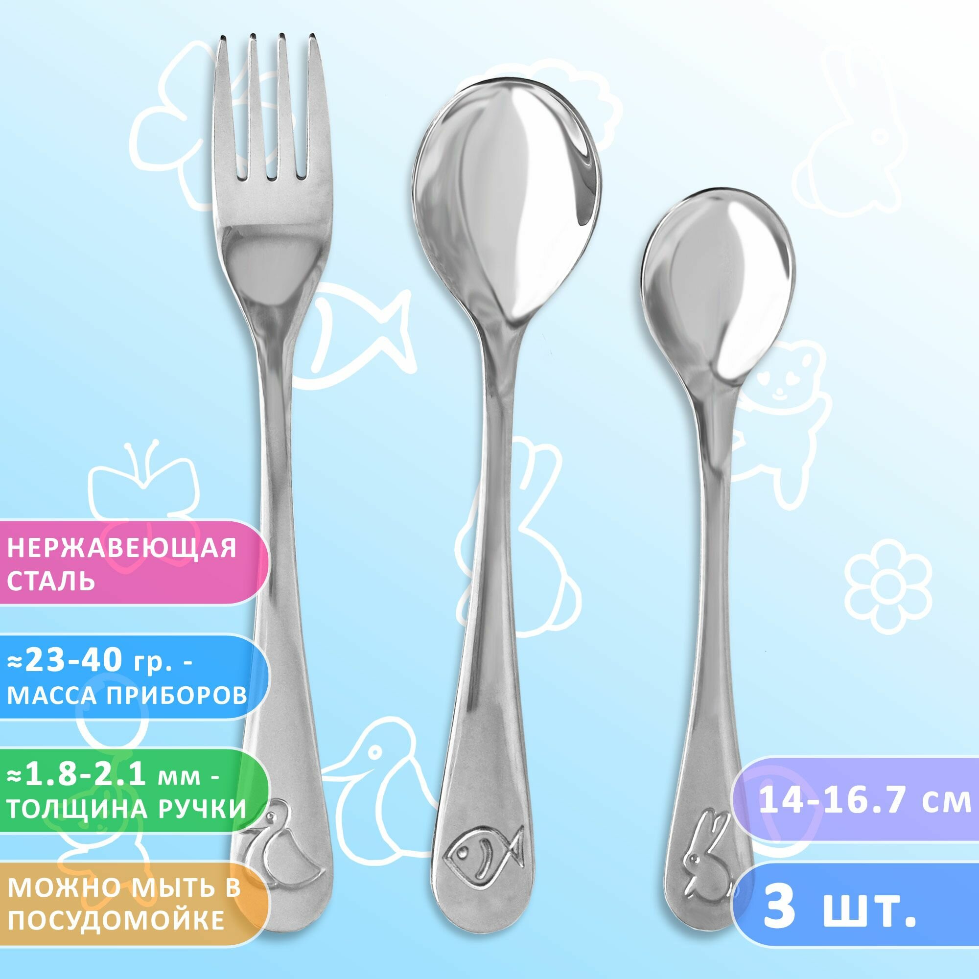 Набор детских столовых приборов VELERCART KIDS (1 столовая ложка, 1 вилка и 1 чайная ложка), 3 предмета