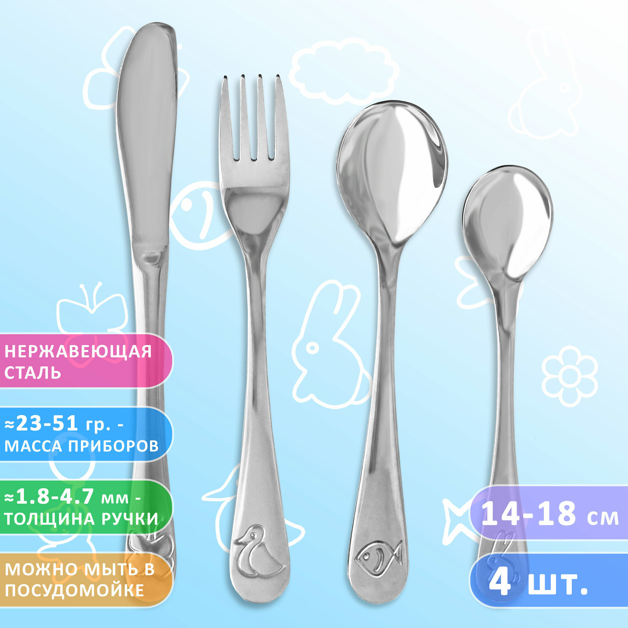 Набор детских столовых приборов VELERCART KIDS (1 столовая ложка, 1 вилка, 1 нож и 1 чайная ложка), нержавеющая сталь, 4 предмета