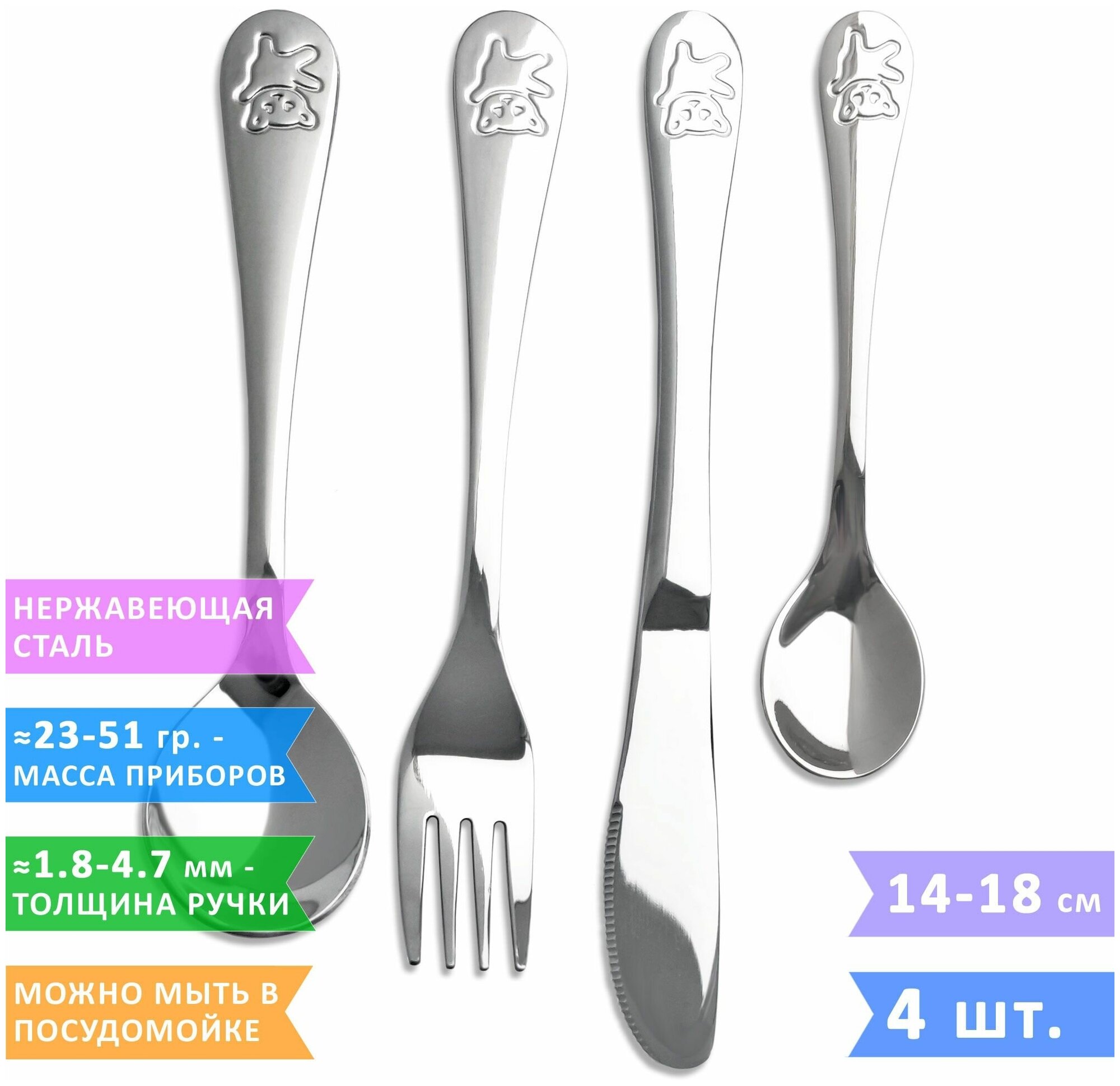Купить Набор детских столовых приборов VELERCART KIDS (1 столовая ложка, 1 вилка, 1 нож и 1 чайная ложка), нержавеющая сталь, 4 предмета