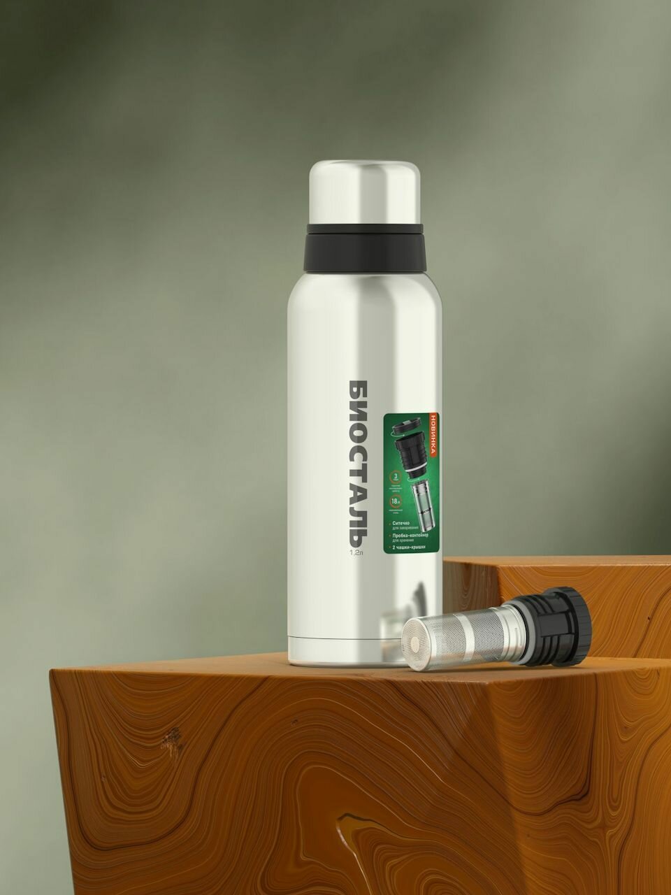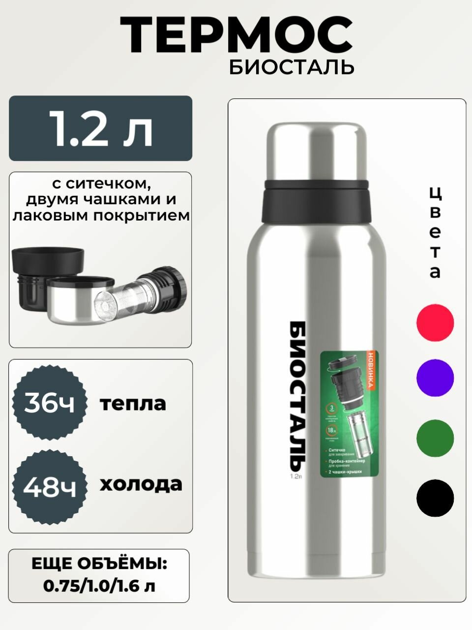 Термос Биосталь 1.2 литра вакуумный с узкой горловиной, пробка-контейнер с ситечком, Biostal 1200 мл интересное: