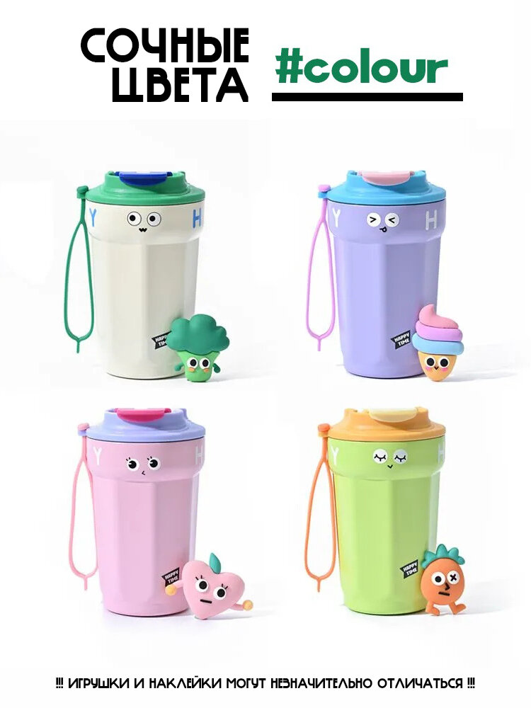 Термокружка для кофе фиолетовая с ремешком и игрушкой, 450мл