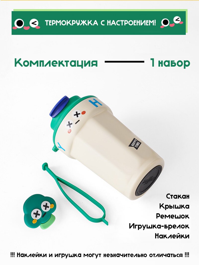 Термокружка для кофе зелёная с ремешком и игрушкой, 450мл