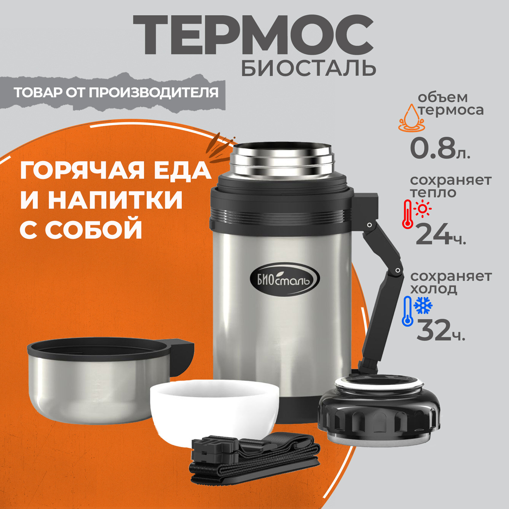 Термос универсальный Вакуумный, доп чашка и ручка для переноски, Биосталь/Biostal (0.8), NG-800-1 интересное: