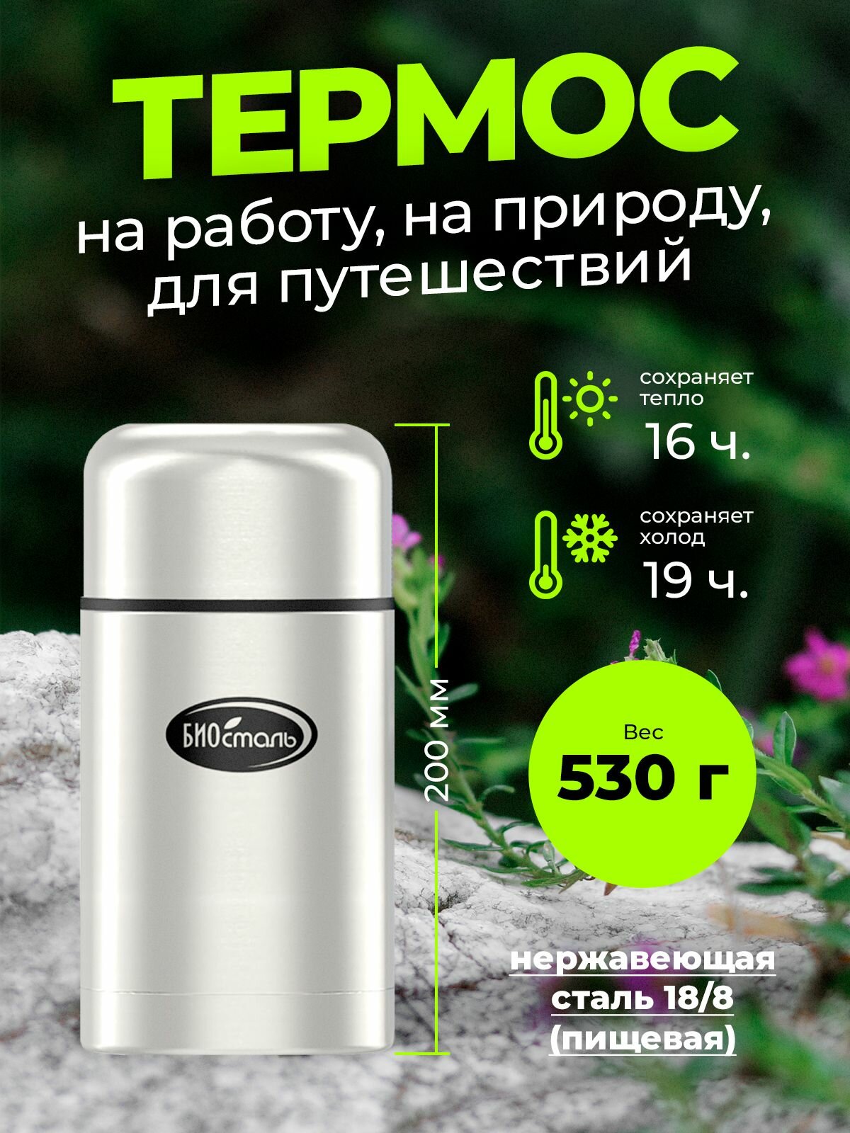 Термос 0.5 литра классический для еды и напитков Биосталь, универсальный