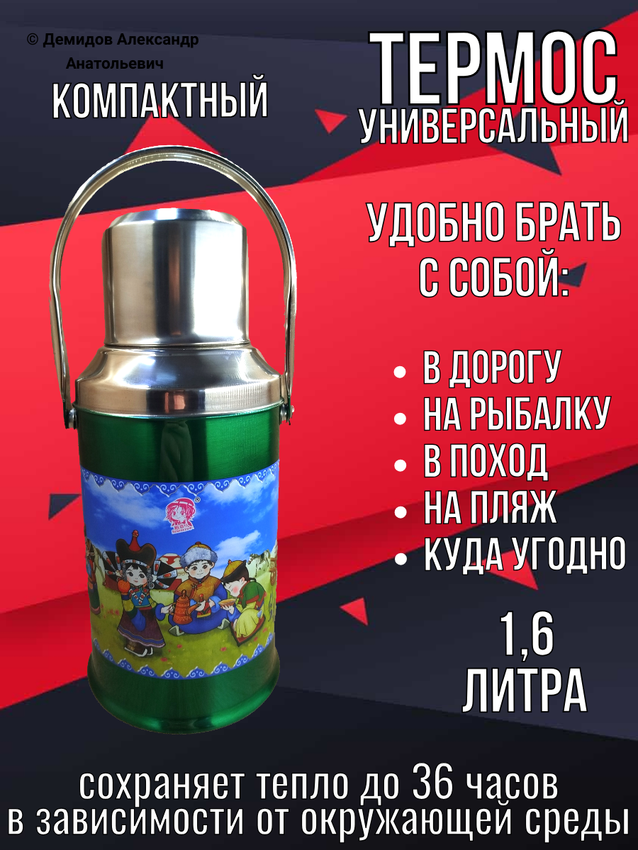 Термос со стеклянной колбой 1,6 литра зеленый с ярким рисунком интересное: