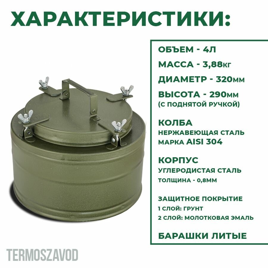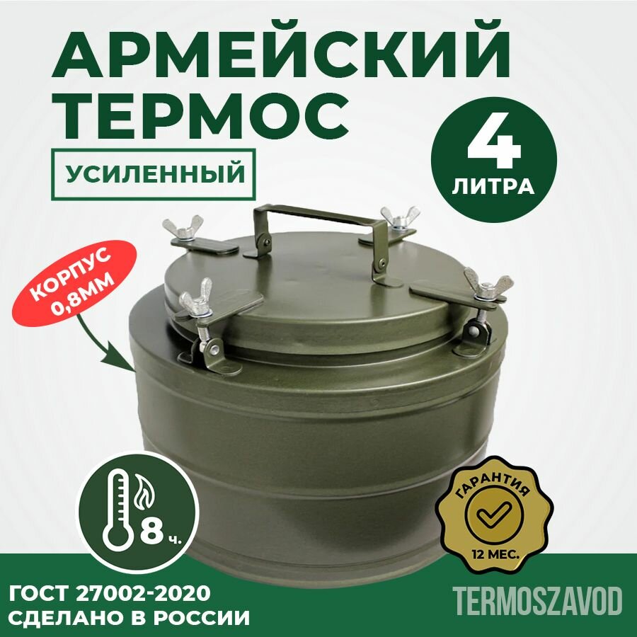Ниже Вы можете прочитать отзывы на Термос армейский ТГ-4, 4 л, широкое горло, для еды и супа, нержавеющая сталь, сохранение тепла до 8 часов, ознакомится с подробными характеристиками, посмотреть интересные обзоры и фотографии на Термос армейский ТГ-4, 4 л, широкое горло, для еды и супа, нержавеющая сталь, сохранение тепла до 8 часов.