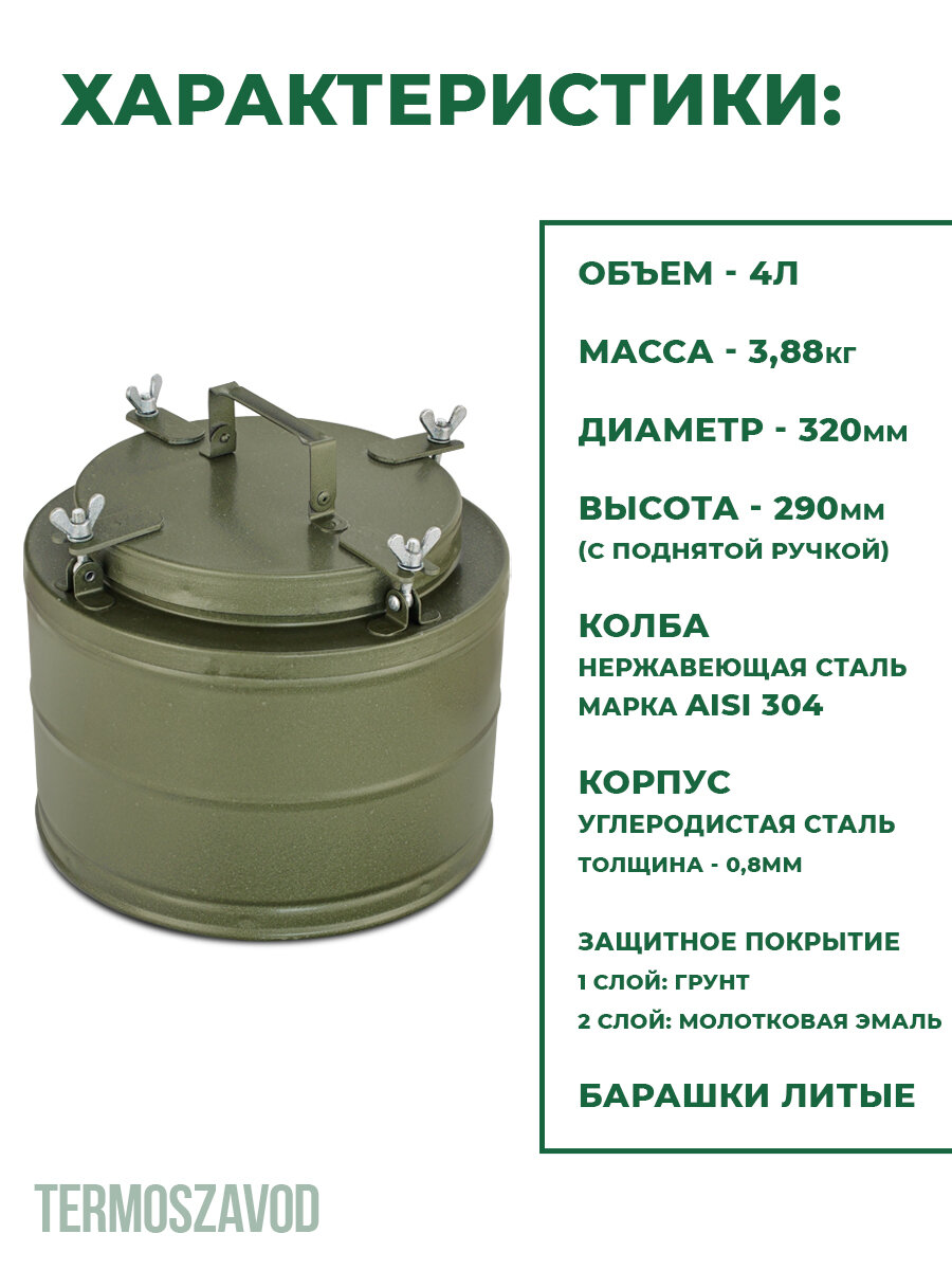 СохранитьТермос армейский ТГ-4, 4 л, широкое горло, для еды и супа, нержавеющая сталь, сохранение тепла до 8 часов интересное: