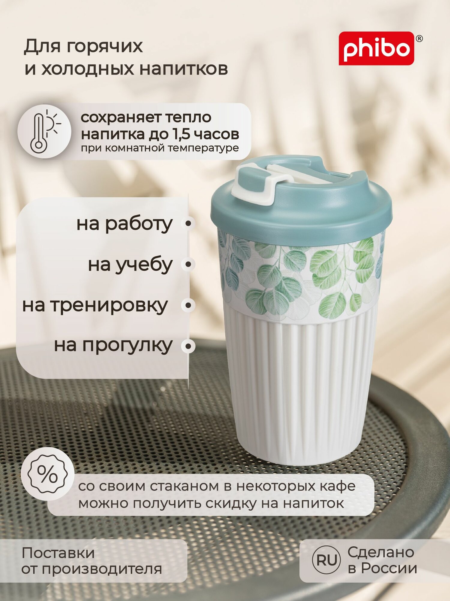 Стакан для горячих напитков с крышкой и клапаном, для кофе, чая (светло-голубой) 450 мл, Phibo интересное: