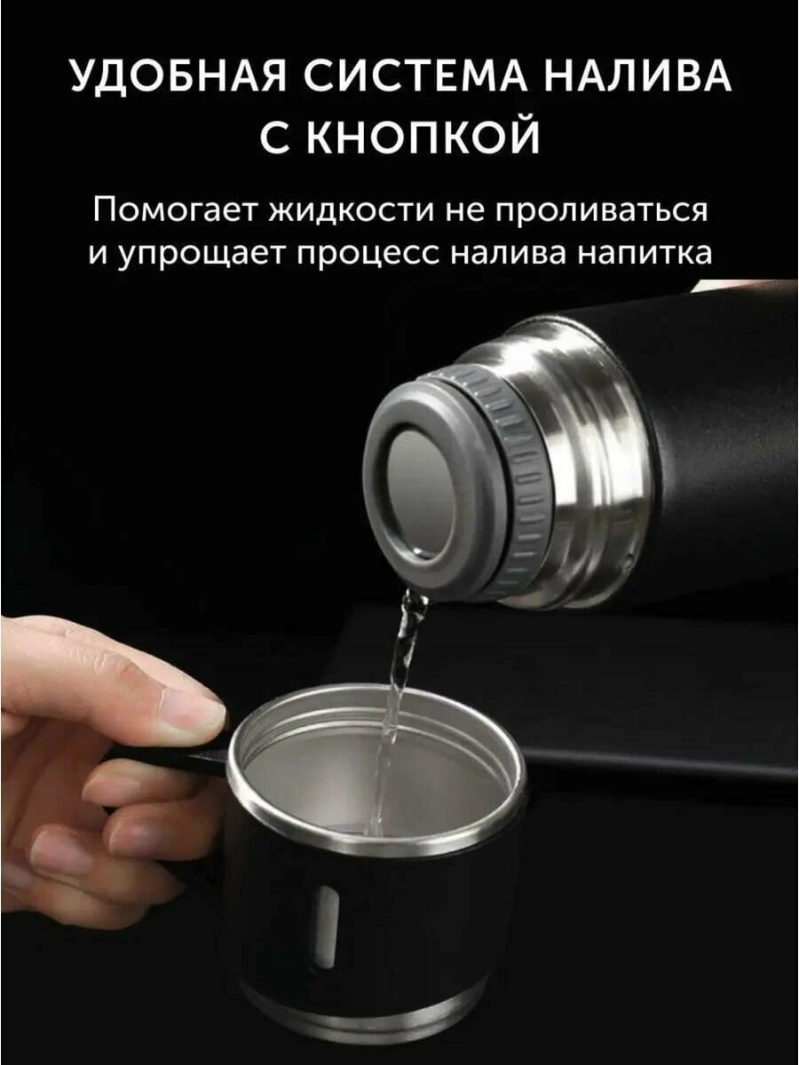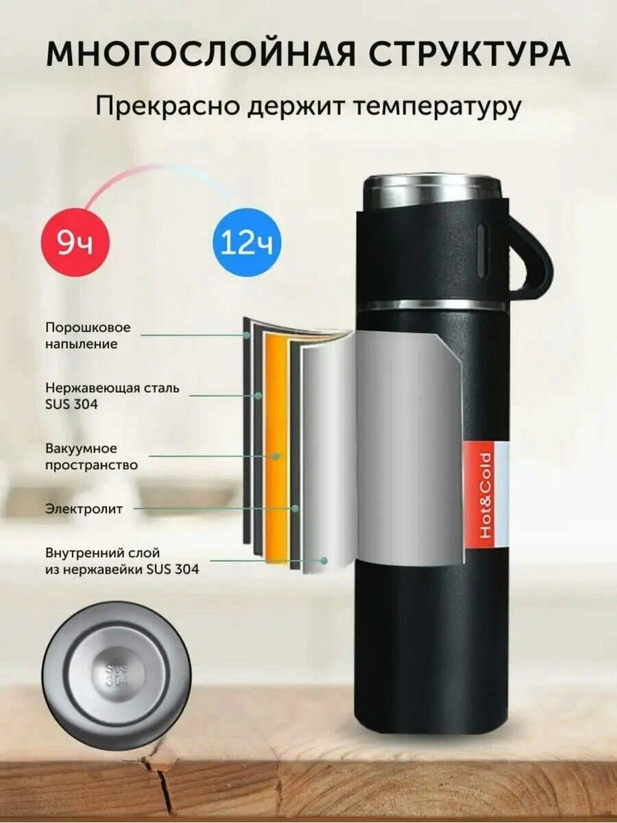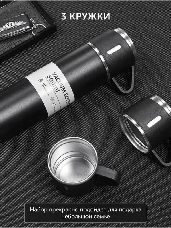 Термос Kattami, с кружками, вакуумный, сохраняет тепло до 12ч, черный, 0,5л интересное: