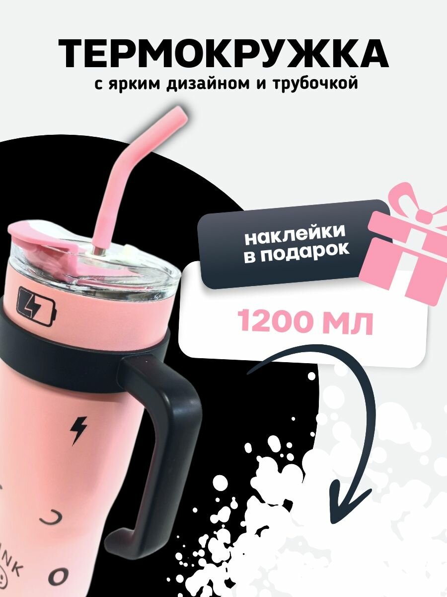 СохранитьТермокружка с трубочкой для холодных и горячих напитков. Розовая PINK. 1200 мл, 27х15см. Наклейки в комплекте интересное: