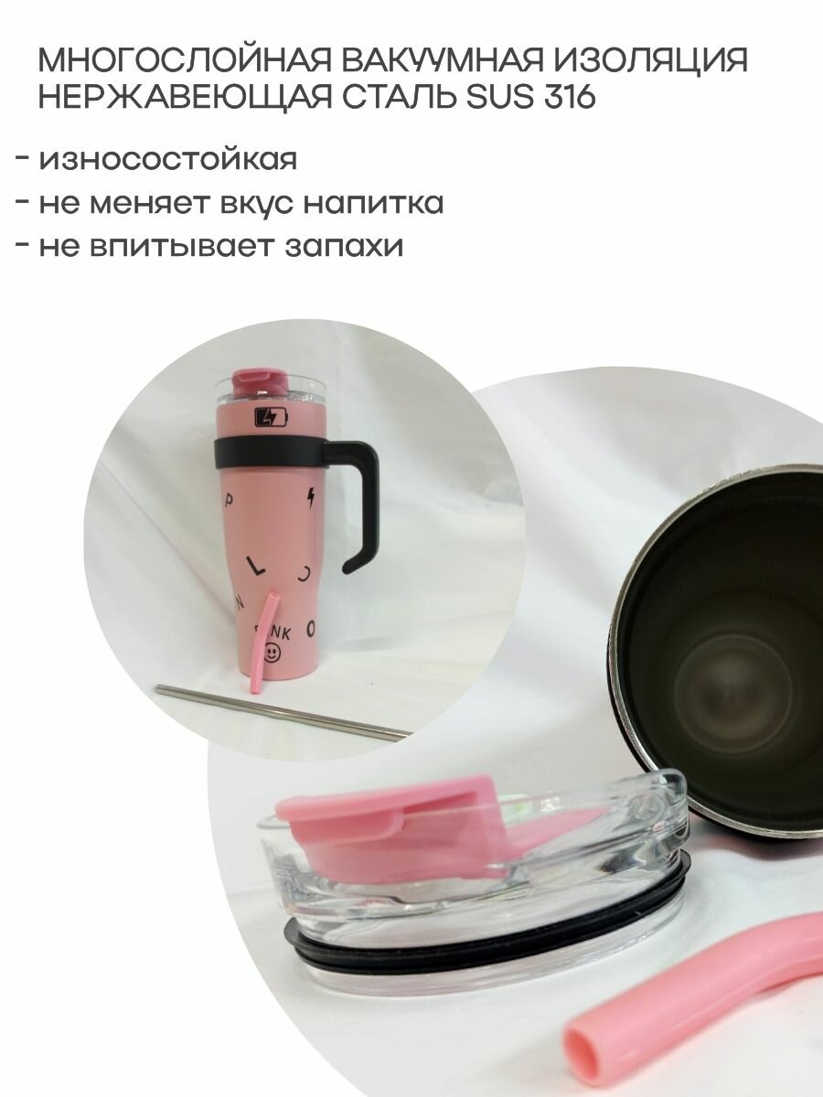 Купить Термокружка с трубочкой для холодных и горячих напитков. Розовая PINK. 1200 мл, 27х15см. Наклейки в комплекте