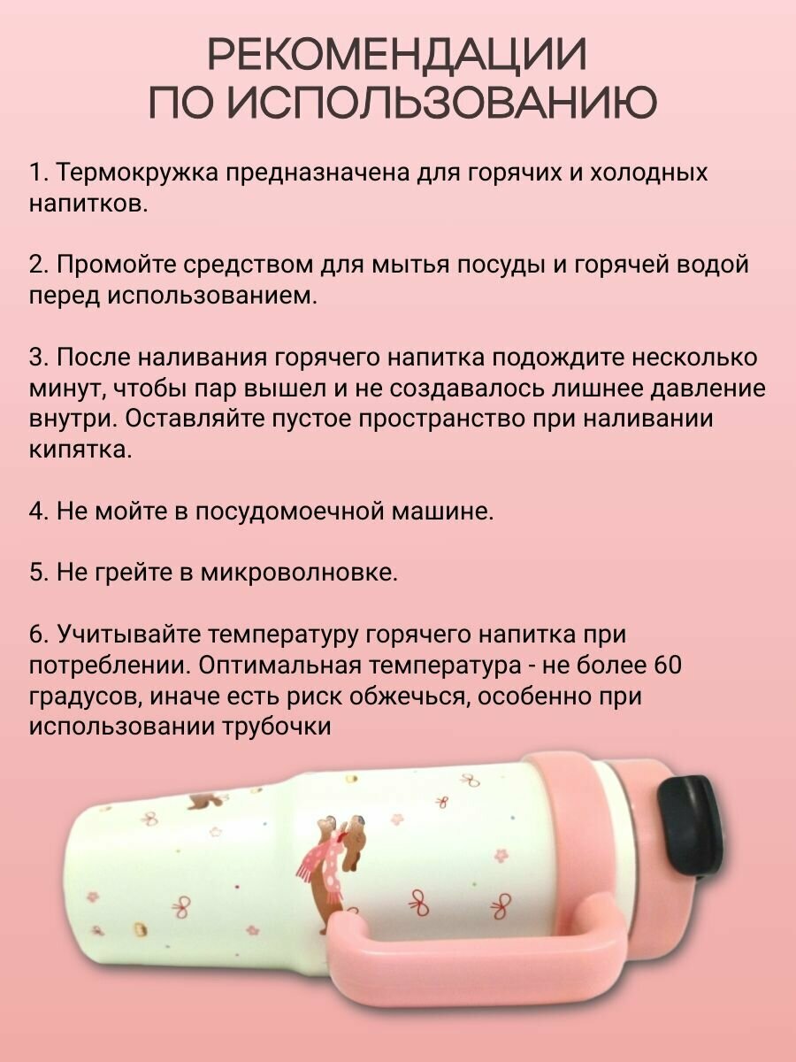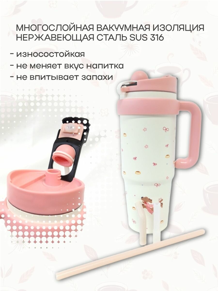 Термокружка с трубочкой для холодных и горячих напитков. Розовая PINK. 1200 мл, 27х15см. Наклейки в комплекте