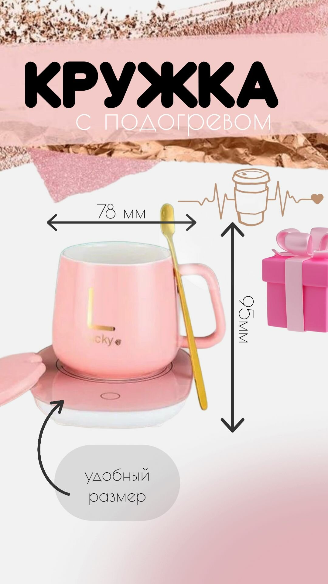Термокружка K-shop, с подогревом, керамическая, розовая, 380мл, с USB интересное: