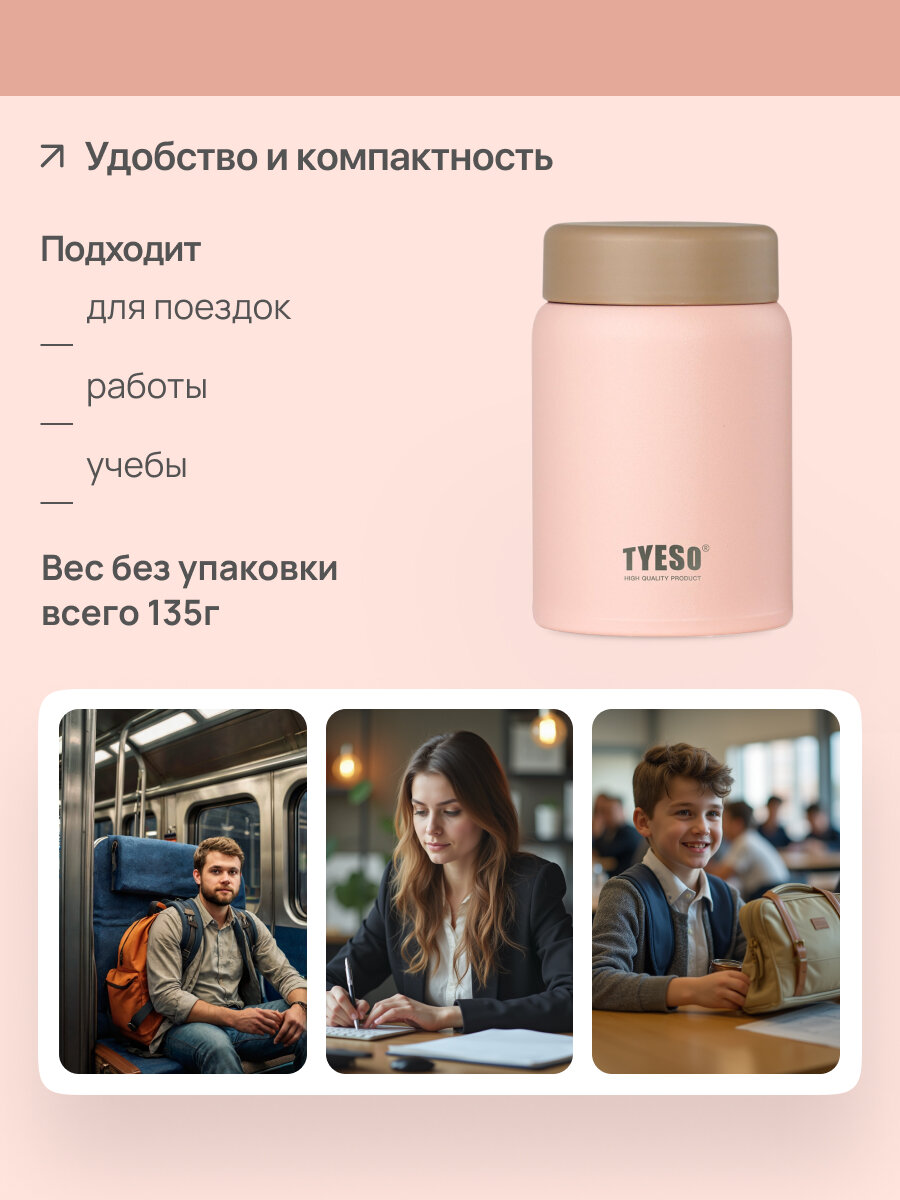 Термос TYESO, для еды, герметичный, нержавеющая сталь, 280мл интересное: