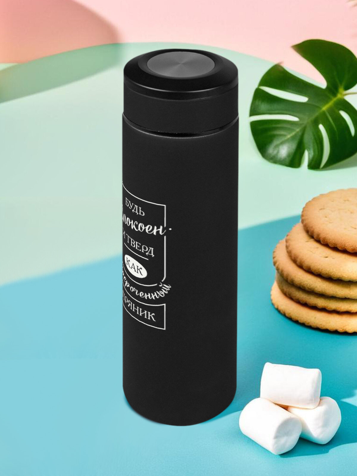 Купить Термос черный для чая вакуумный 0,5 л. с принтом "Будь спокоен и тверд как просроченный пряник"