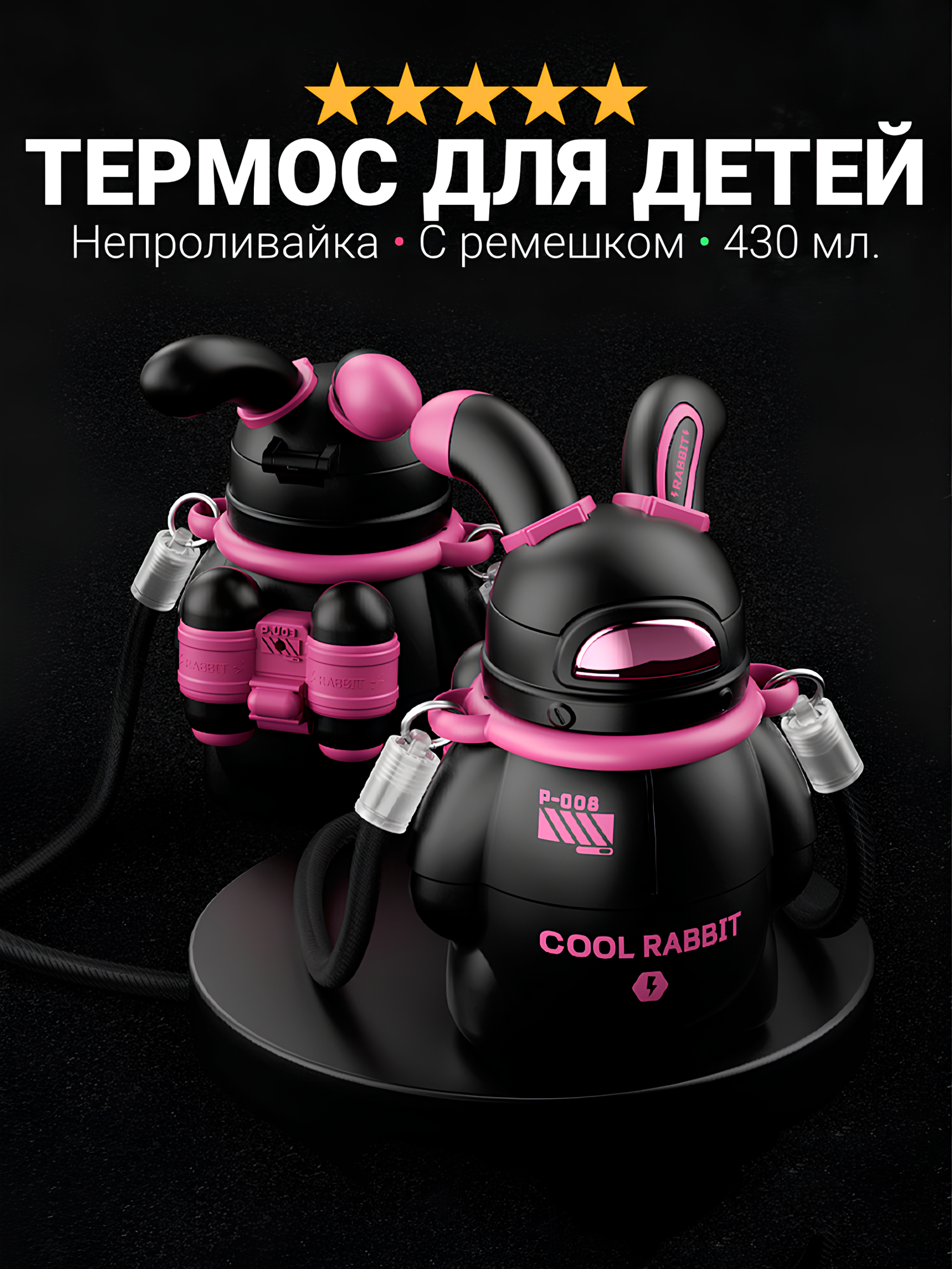 Термос для детей SPACE RABBIT, непроливайка с ремешком и кнопкой открытия c трубочкой 430 мл, черный интересное: