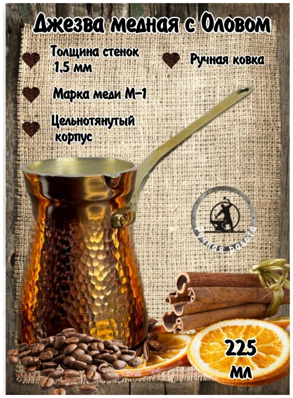 Турка медная кованая, джезва медная ручной работы, лужение олово, чеканка, 225мл интересное: