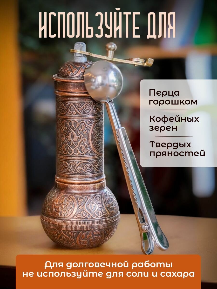 Кофемолка ручная с ложкой для кофе металлическая турецкая ( мельница для специй, пряностей и зерен бронзовая ) интересное:
