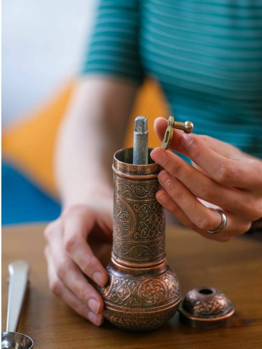 Купить Кофемолка ручная с ложкой для кофе металлическая турецкая ( мельница для специй, пряностей и зерен бронзовая )