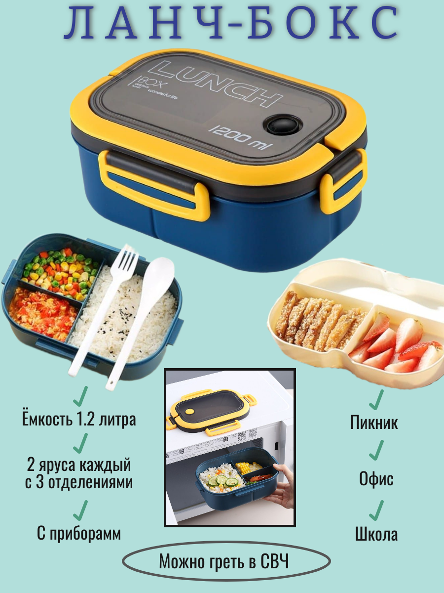 Ланч-бокс, для еды, с секциями, с крышкой, с ложкой и вилкой, синий интересное: